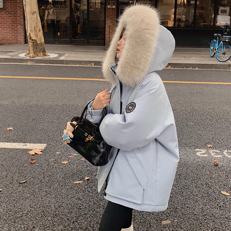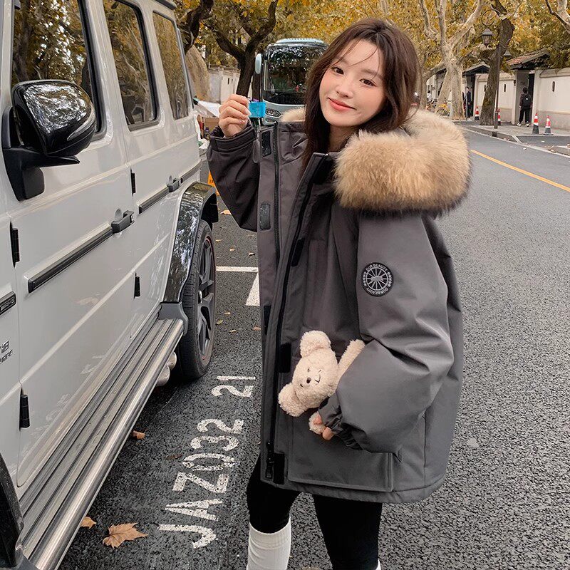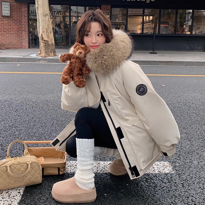 📚 2025年韩版宽松貉子毛连帽白鸭绒工装外套加厚显瘦冲锋衣羽绒服女