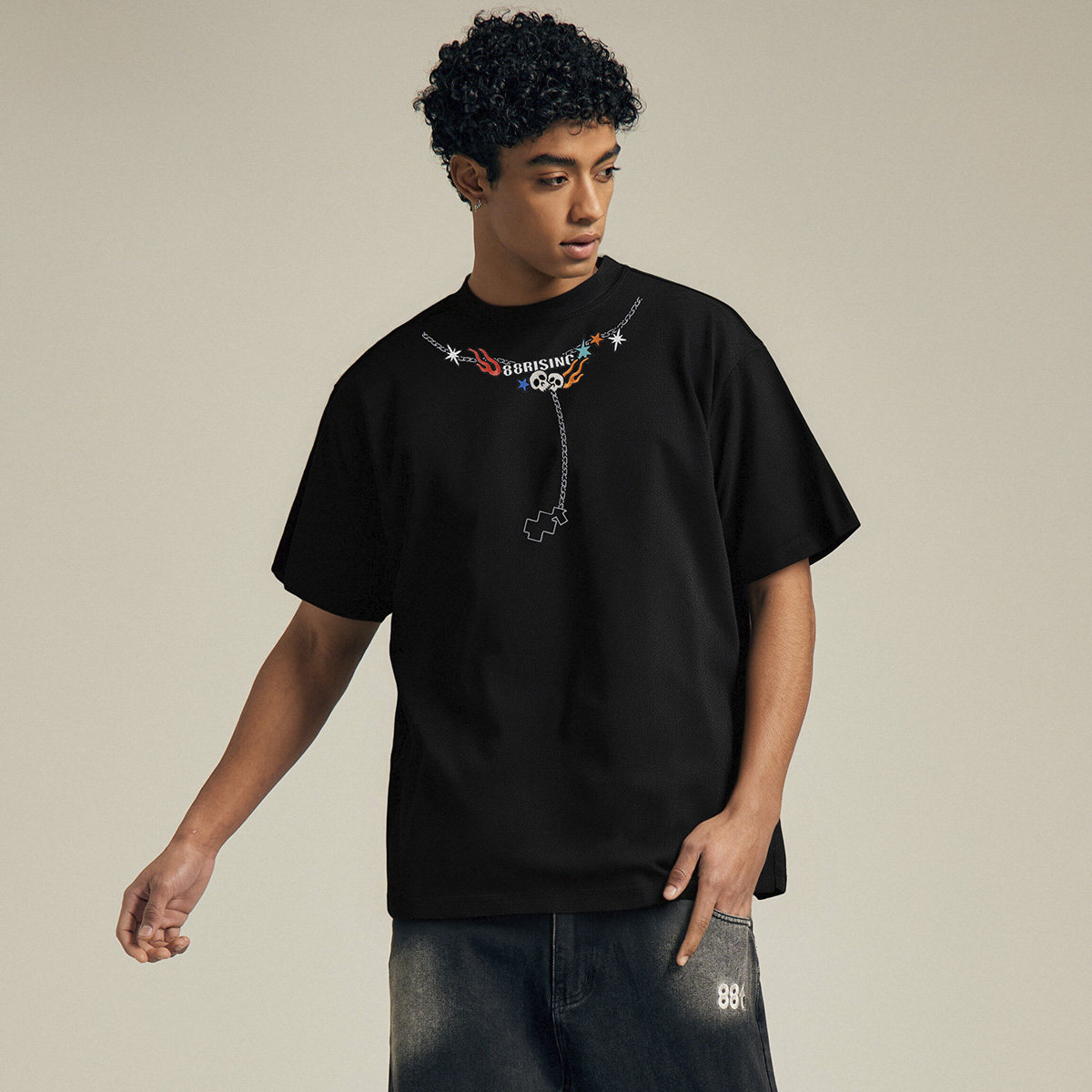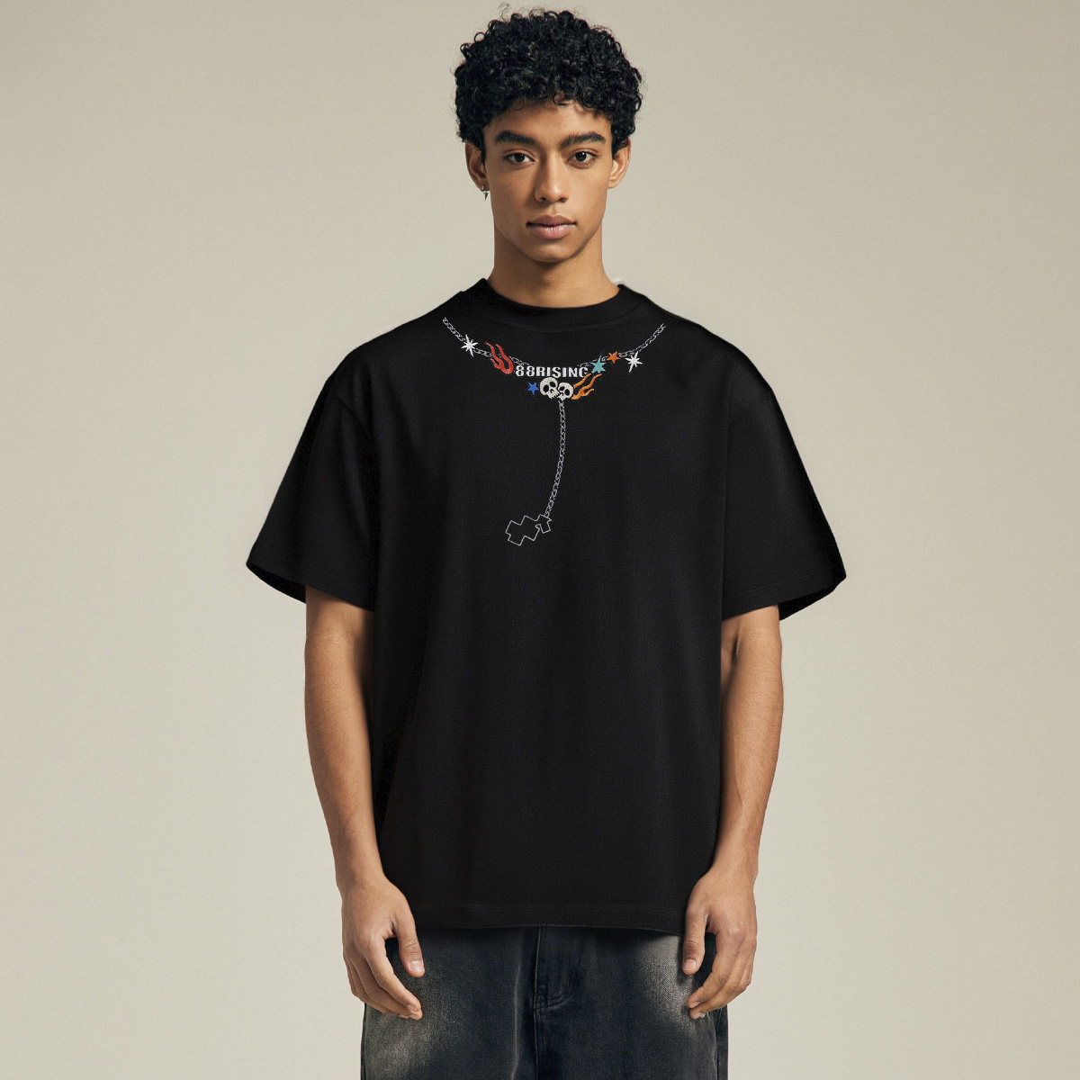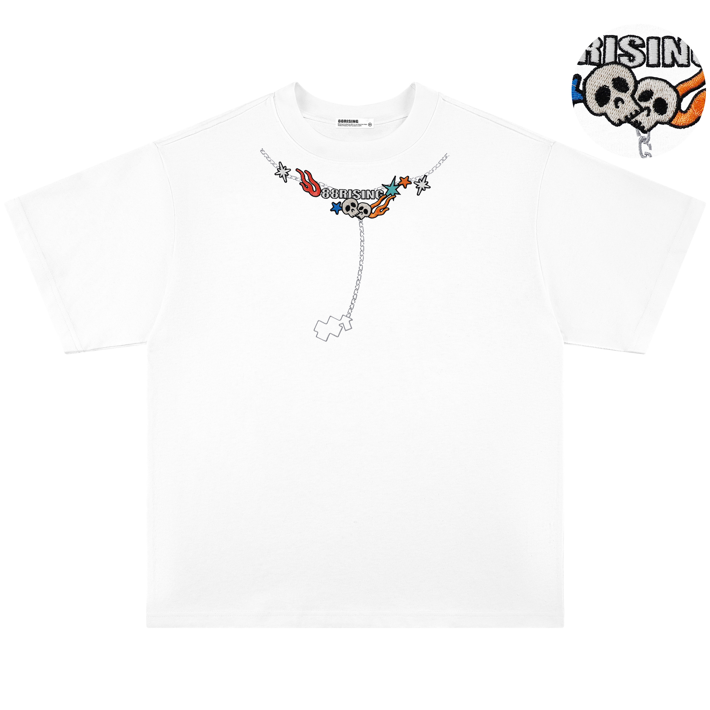 📚 88rising 美式火焰骷髅项链刺绣多元素ins街头纯棉情侣短袖T恤