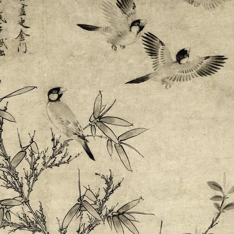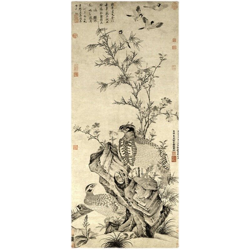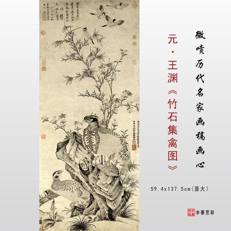 📚 元 王渊 竹石集禽图微喷宋元花鸟画临摹高清绢布画稿传统花鸟范本