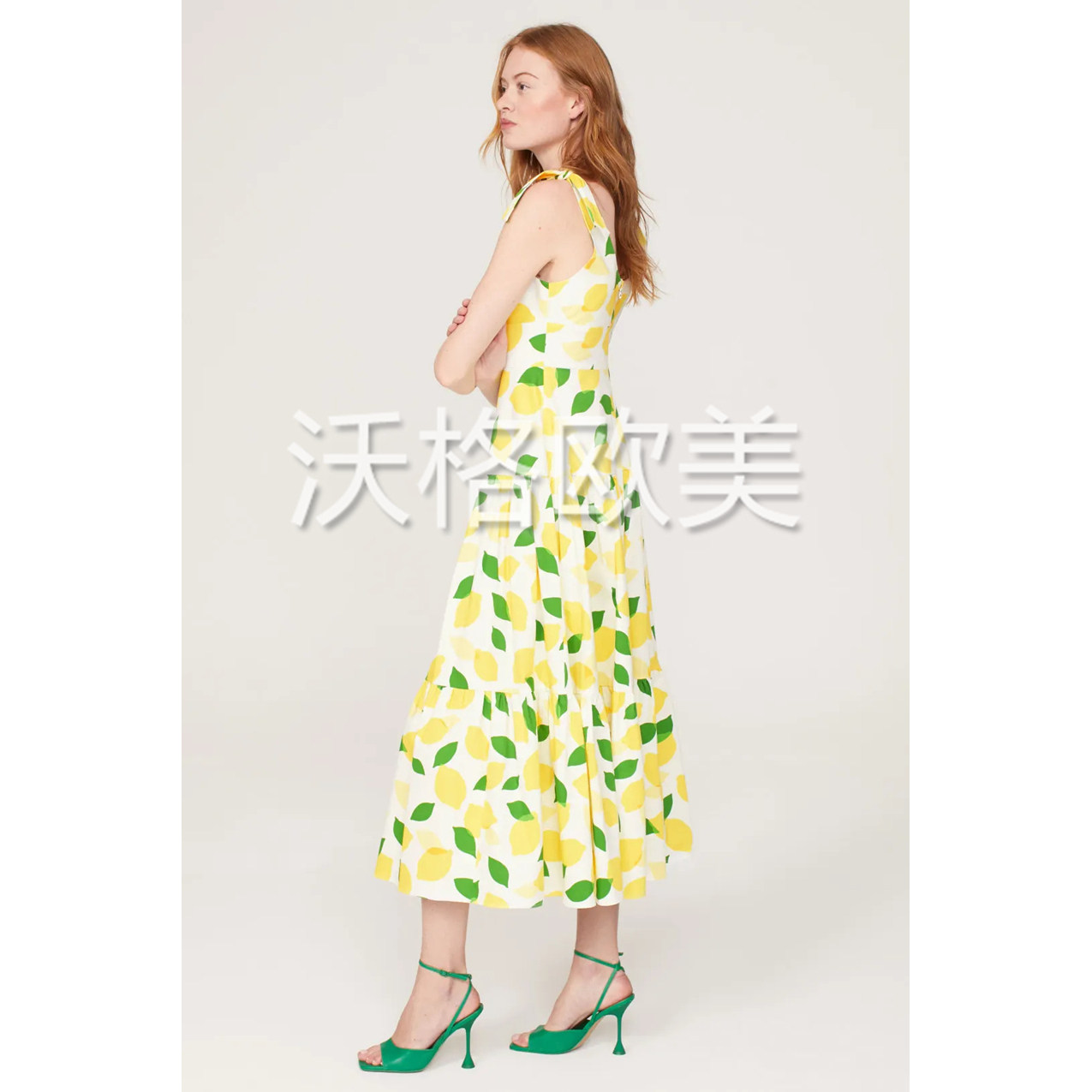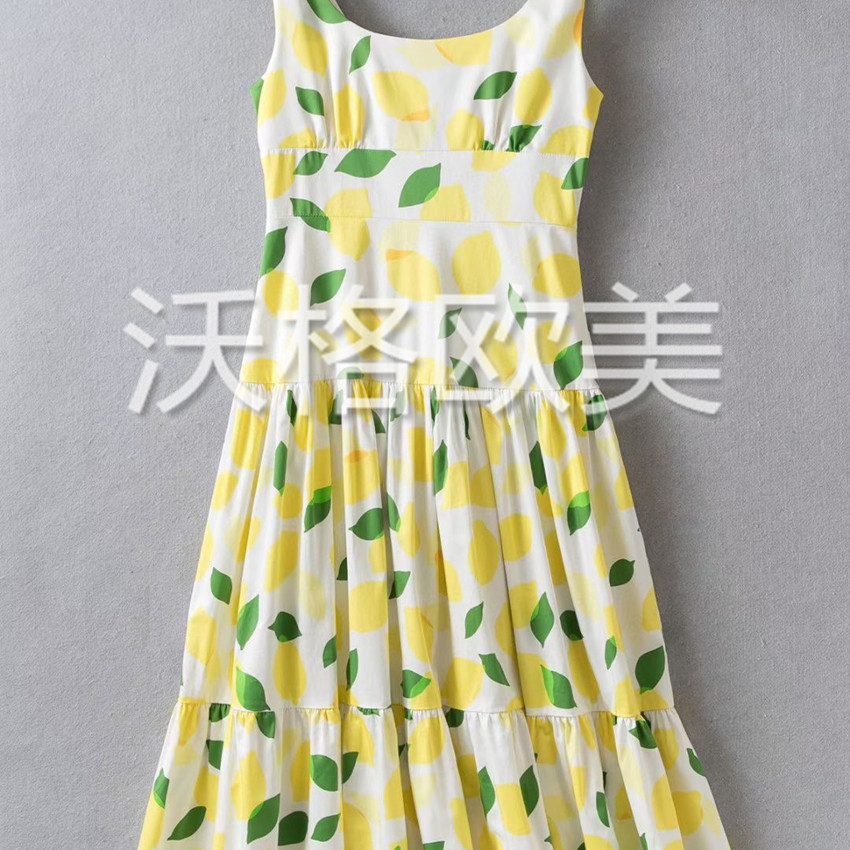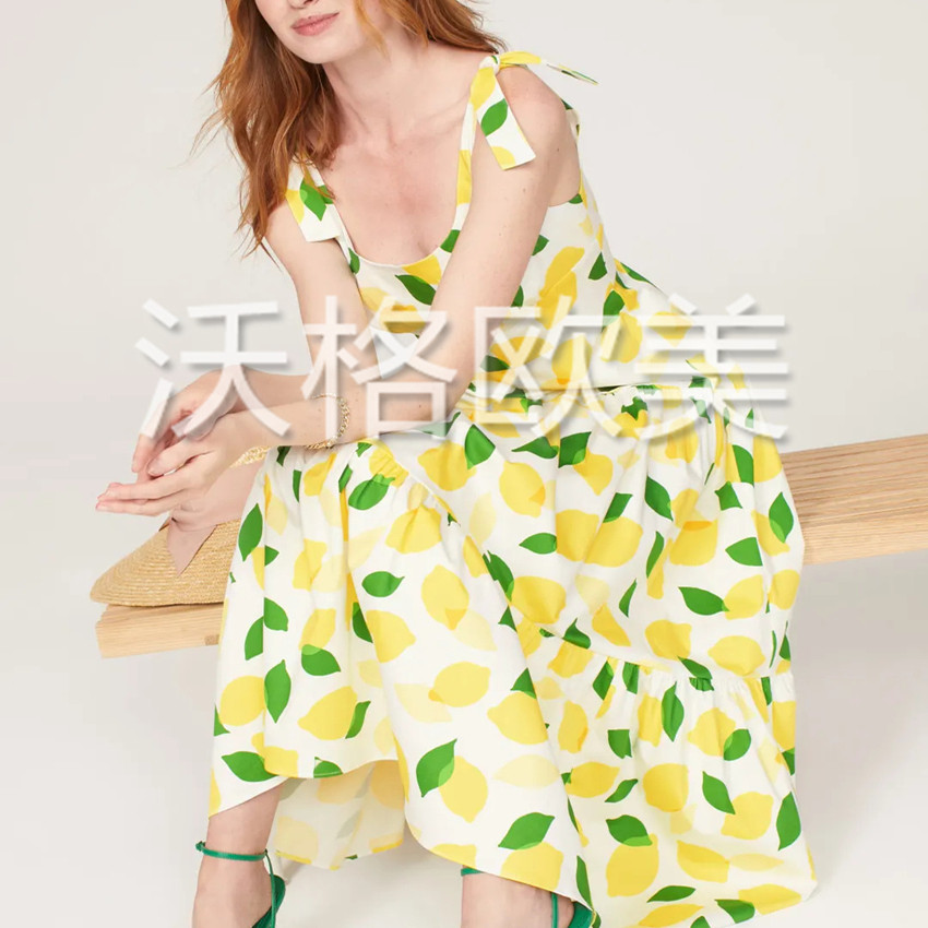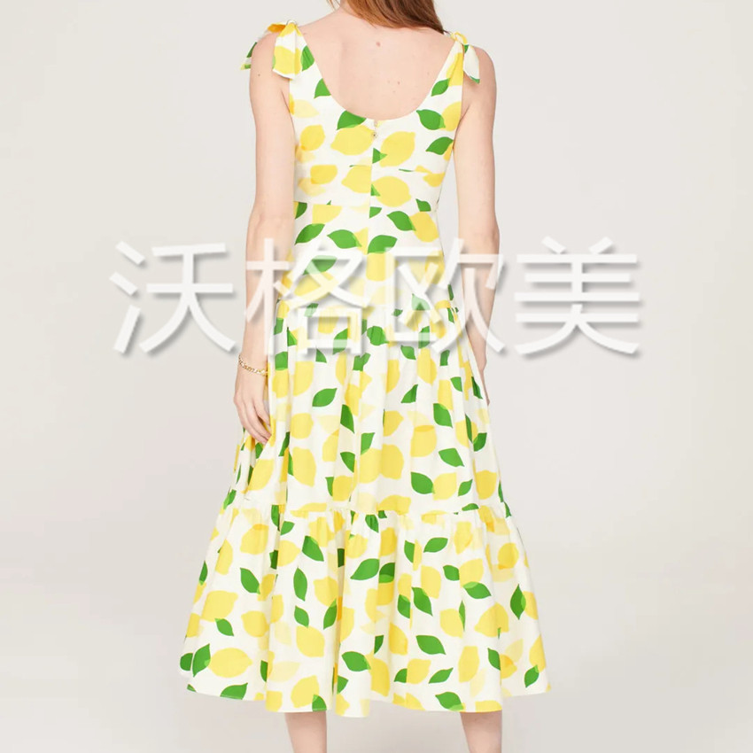 📚 沃格KS夏季新款粉白2色清新柠檬印花高腰A字中长棉绑扎吊带连衣裙