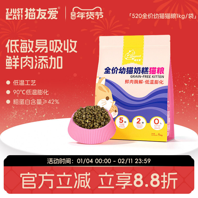 📚 猫友爱520高蛋白幼猫专用鲜肉粮布偶营养免疫增肥奶糕无谷猫粮1kg