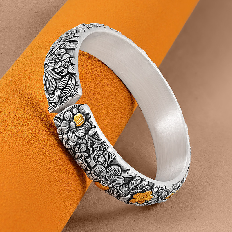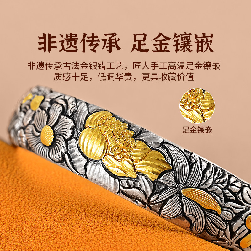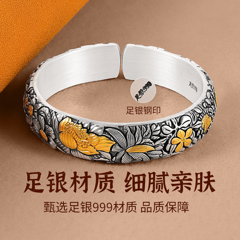 📚 银千造 十二花神非遗镶金实心开口银手镯泥鳅背银镯子妈妈款银镯