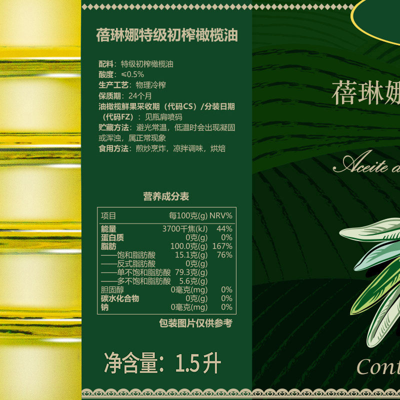 📚 蓓琳娜欧洲原油进口100%特级初榨纯正橄榄油食用1.5L轻食炒菜家用