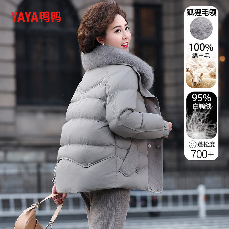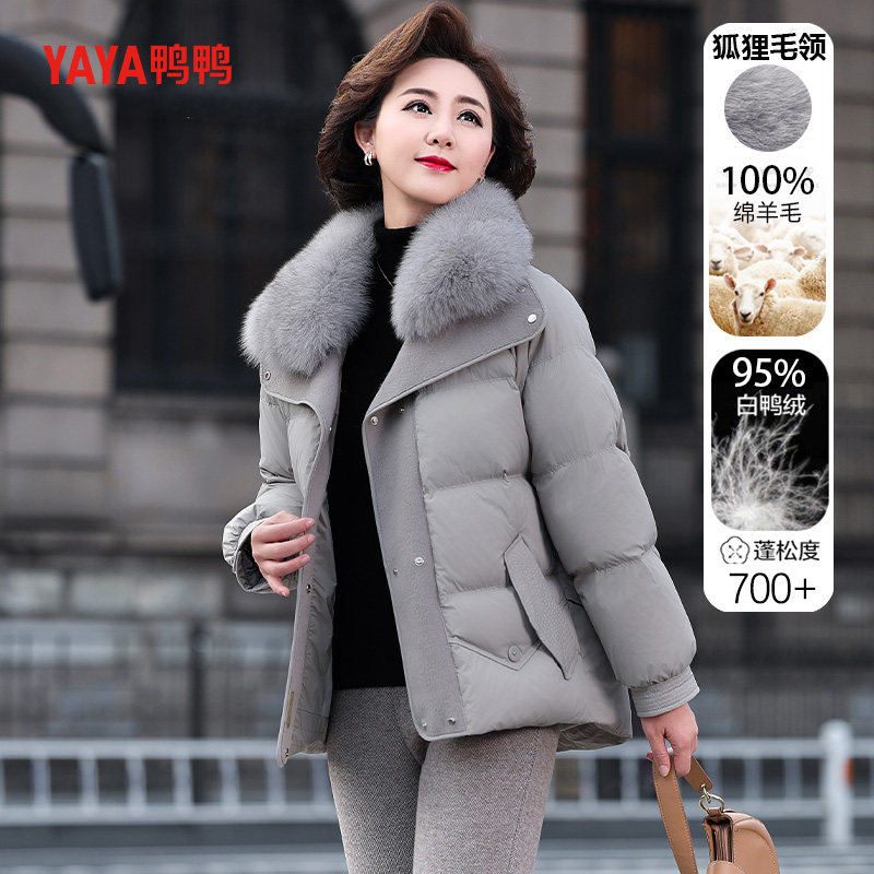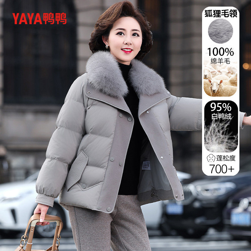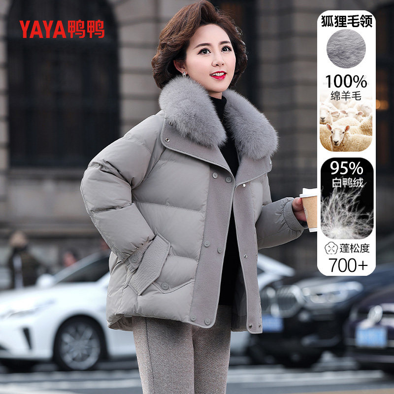 📚 鸭鸭短款羽绒服女款中年妈妈洋气毛呢拼接冬装中老年狐狸毛领外套