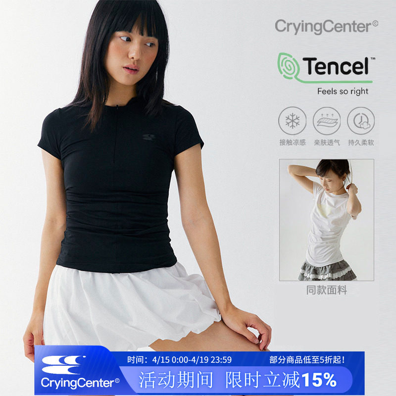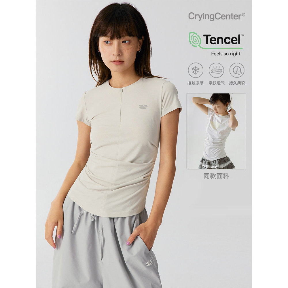 📚 CryingCenter 凉感系列圆领前中开襟隐形拉链两侧褶皱短袖上衣