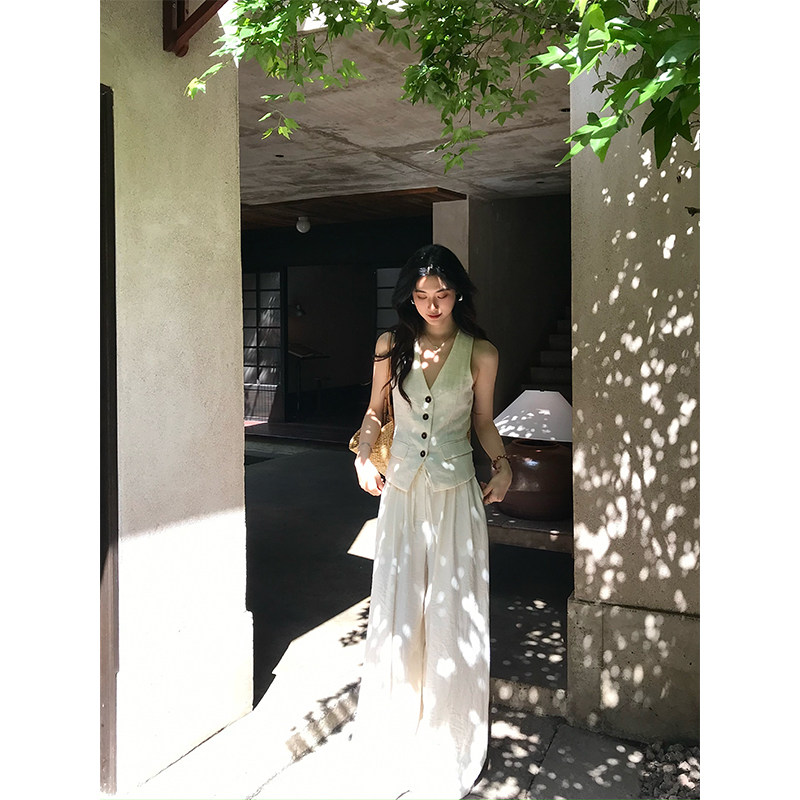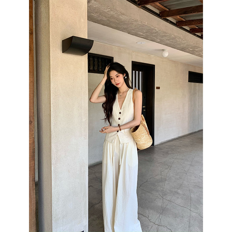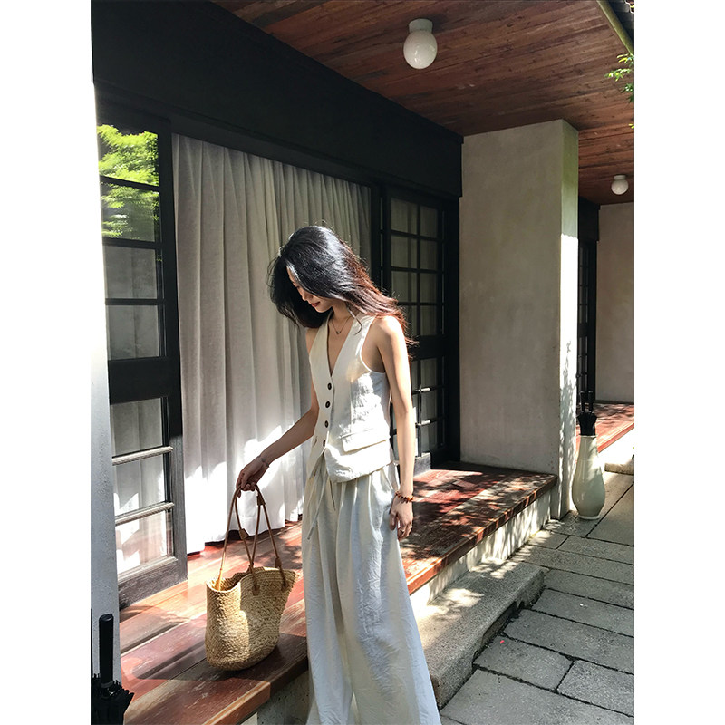 📚 Norain不下雨【现货】杏色棉麻老钱v领马甲背心阔腿休闲裤套装