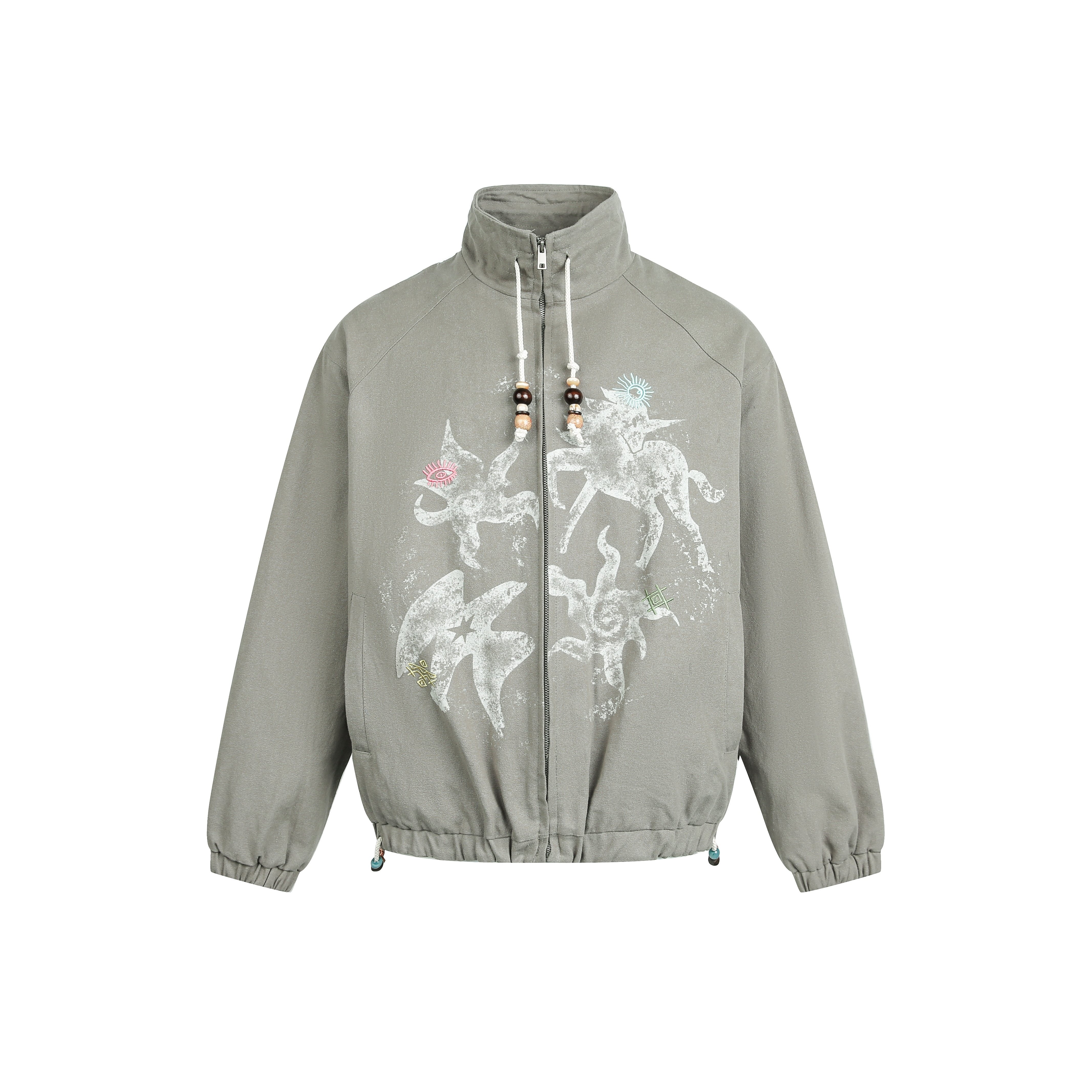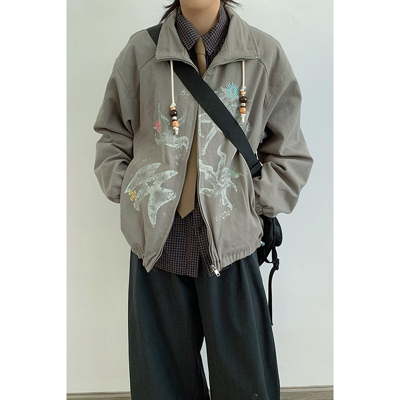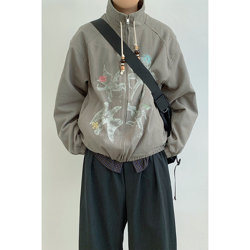 📚 春秋游牧风印花立领工装夹克男女生宽松情侣巴恩风猎户外套学生潮
