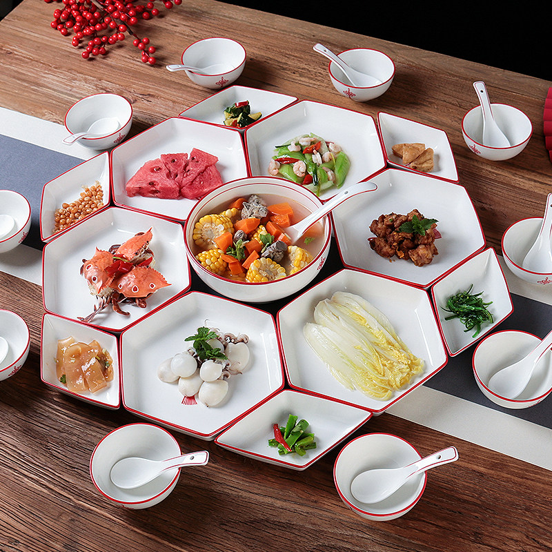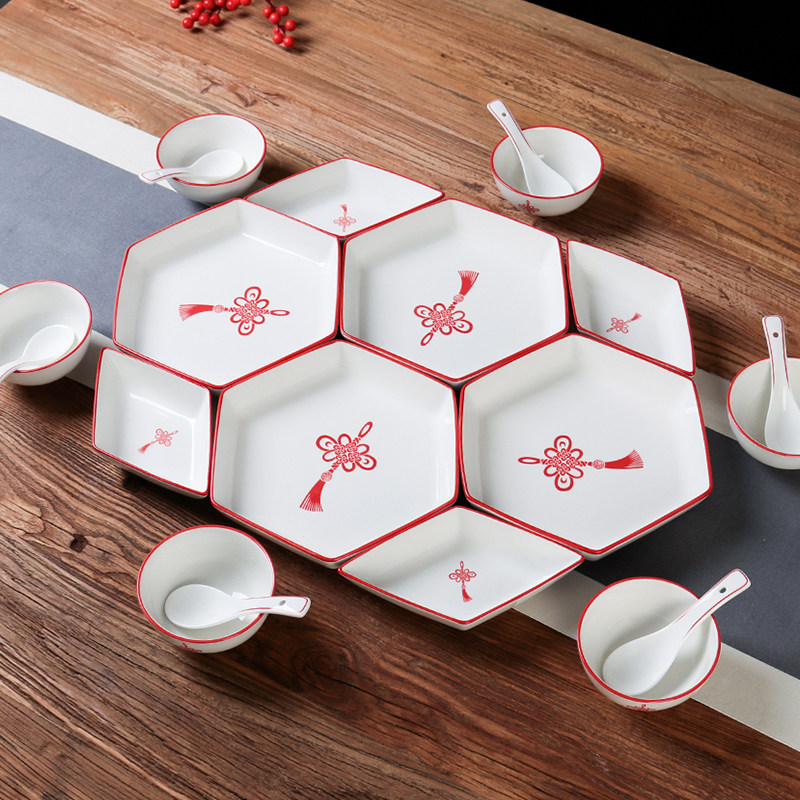 📚 红色喜庆中国结过年家用盘子陶瓷拼盘组合套装网红团圆长方桌餐具