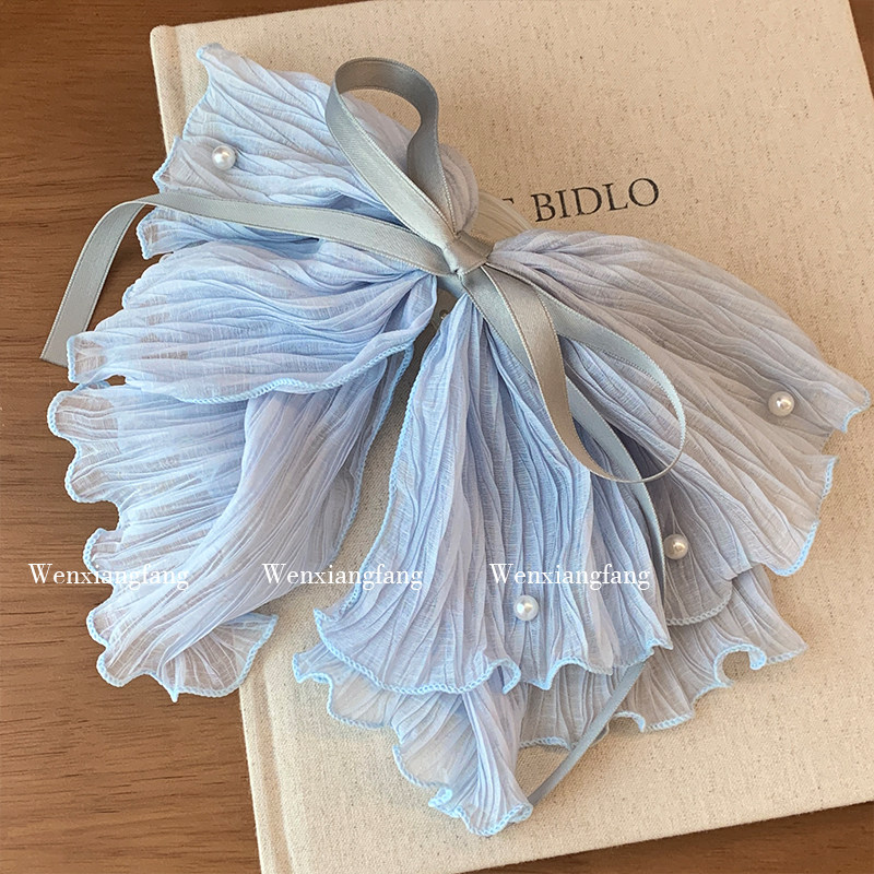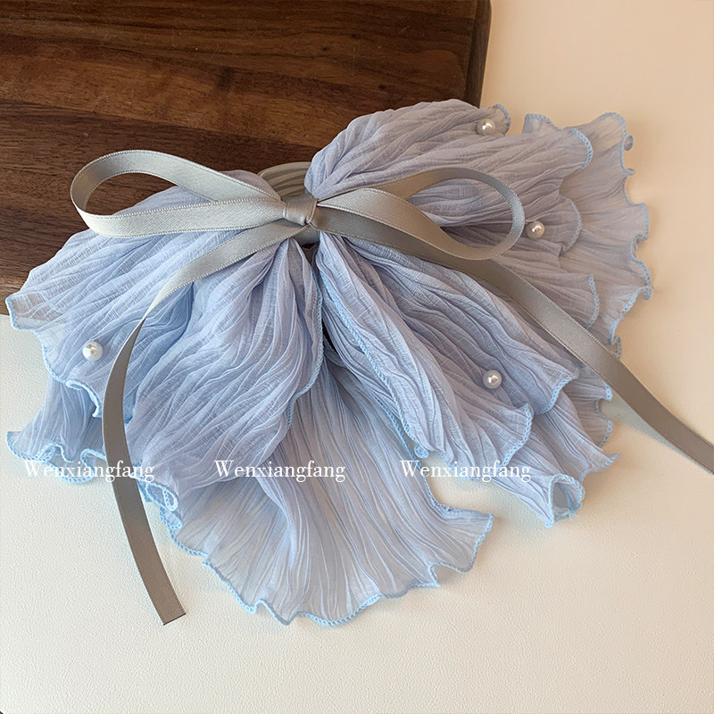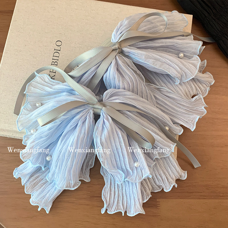 📚 雾霾蓝珍珠蝴蝶结丝带网纱抓夹女高级感盘发高颅顶固定发夹头饰潮