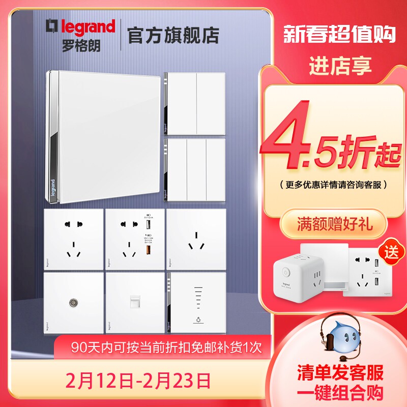 📚 罗格朗开关插座面板多孔家用暗装五插双开16a空调usb逸远素月白