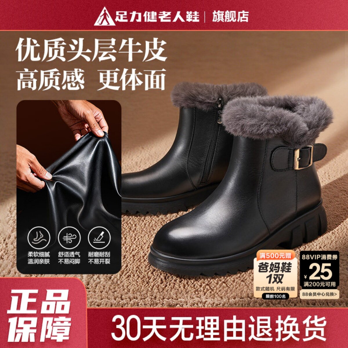 #足力健旗舰店 #冬季鞋款 #加绒短靴 #保暖棉鞋 #加厚冬季黑色皮鞋靴子
