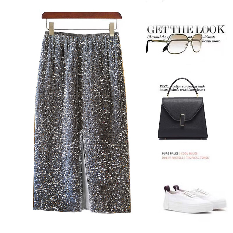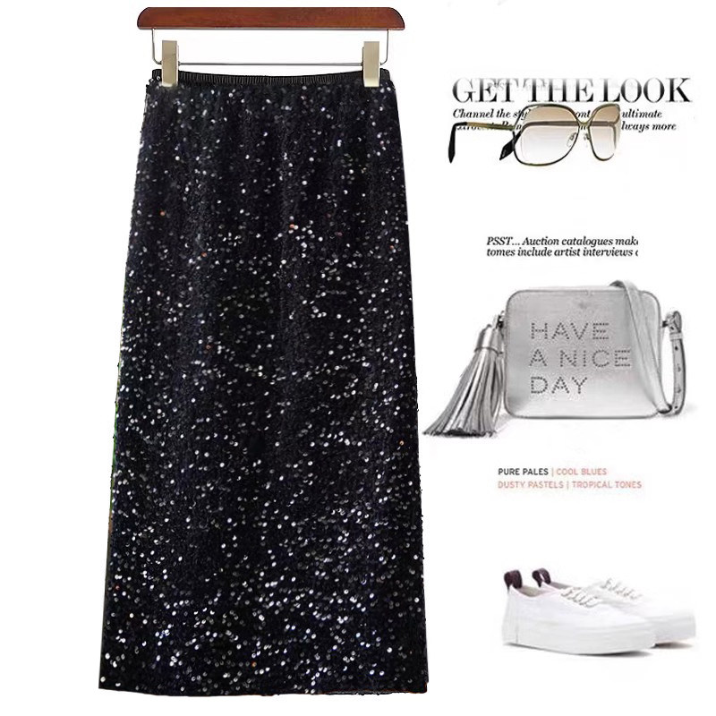 📚 流光摇曳 重工丝绒亮片半身裙 高腰显瘦松紧腰后开叉中长款半裙