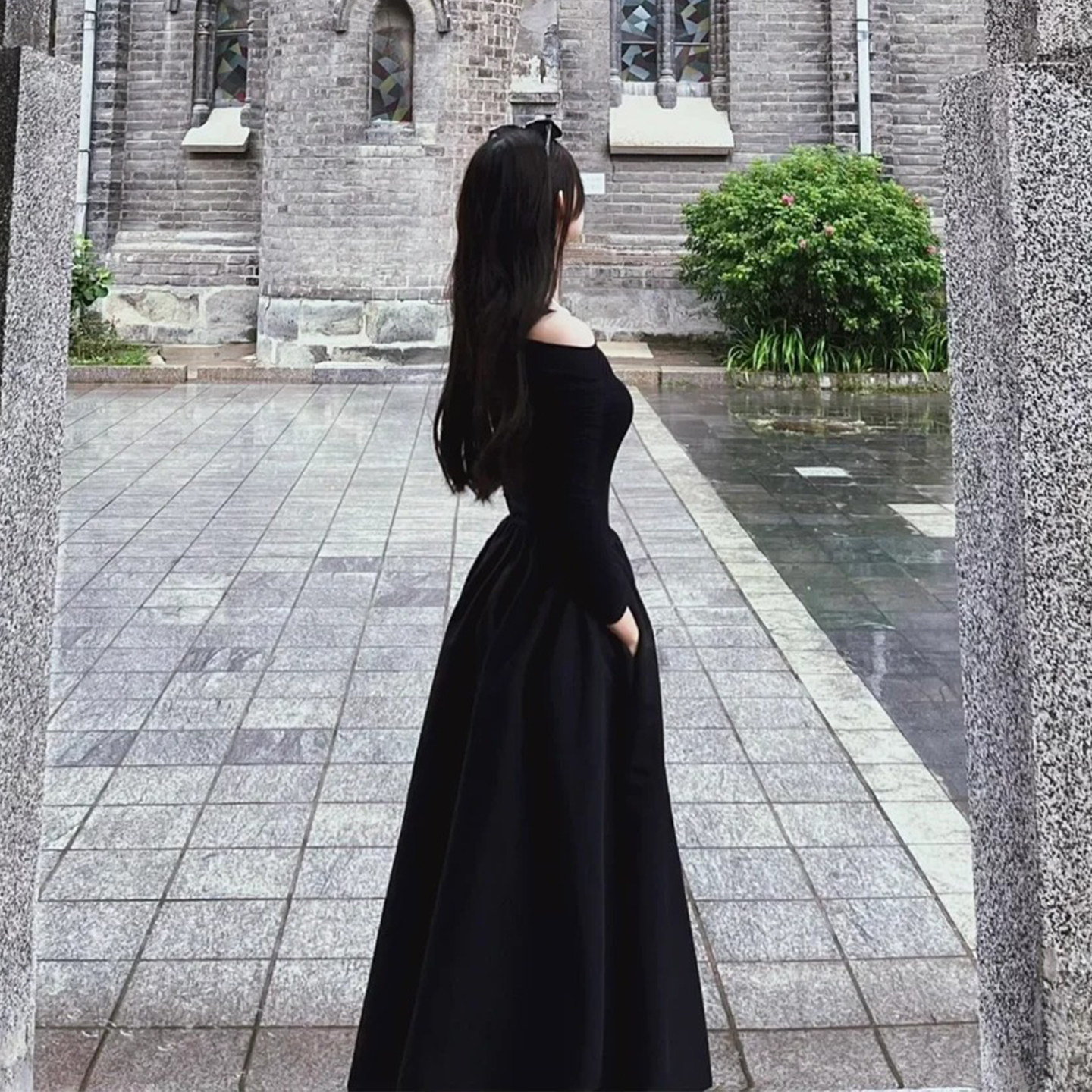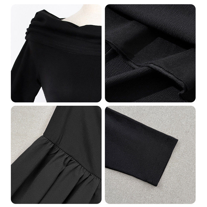 📚 一字肩连衣裙女秋冬天小黑裙晚礼服高级感黑色针织长袖长裙子法式