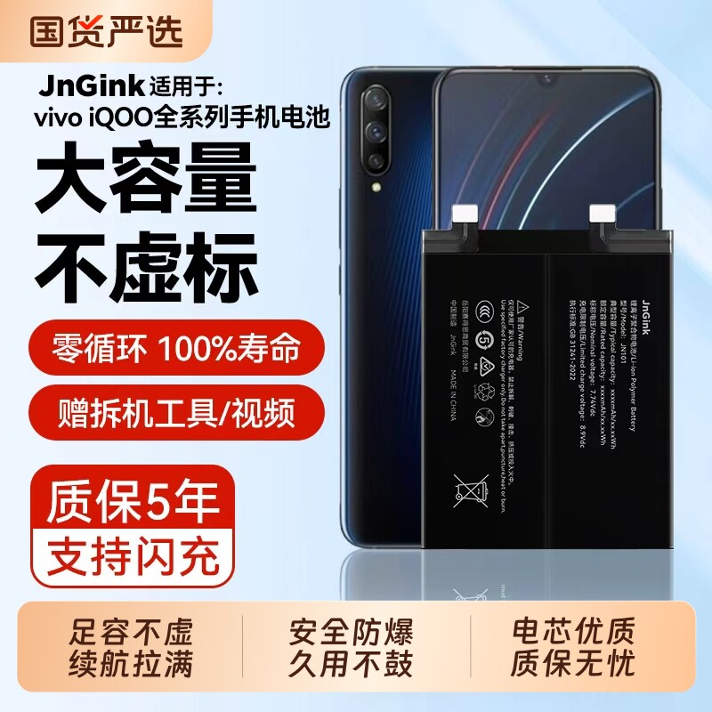 📚 JnGinK适用vivo iQOOneo5电池neo8/9原厂iqoo3/5/7/8/9/10pro/11s/12更换neo7手机6se一代iqooz3z5z6x大容量