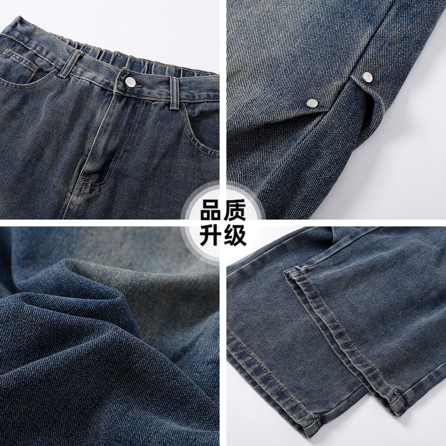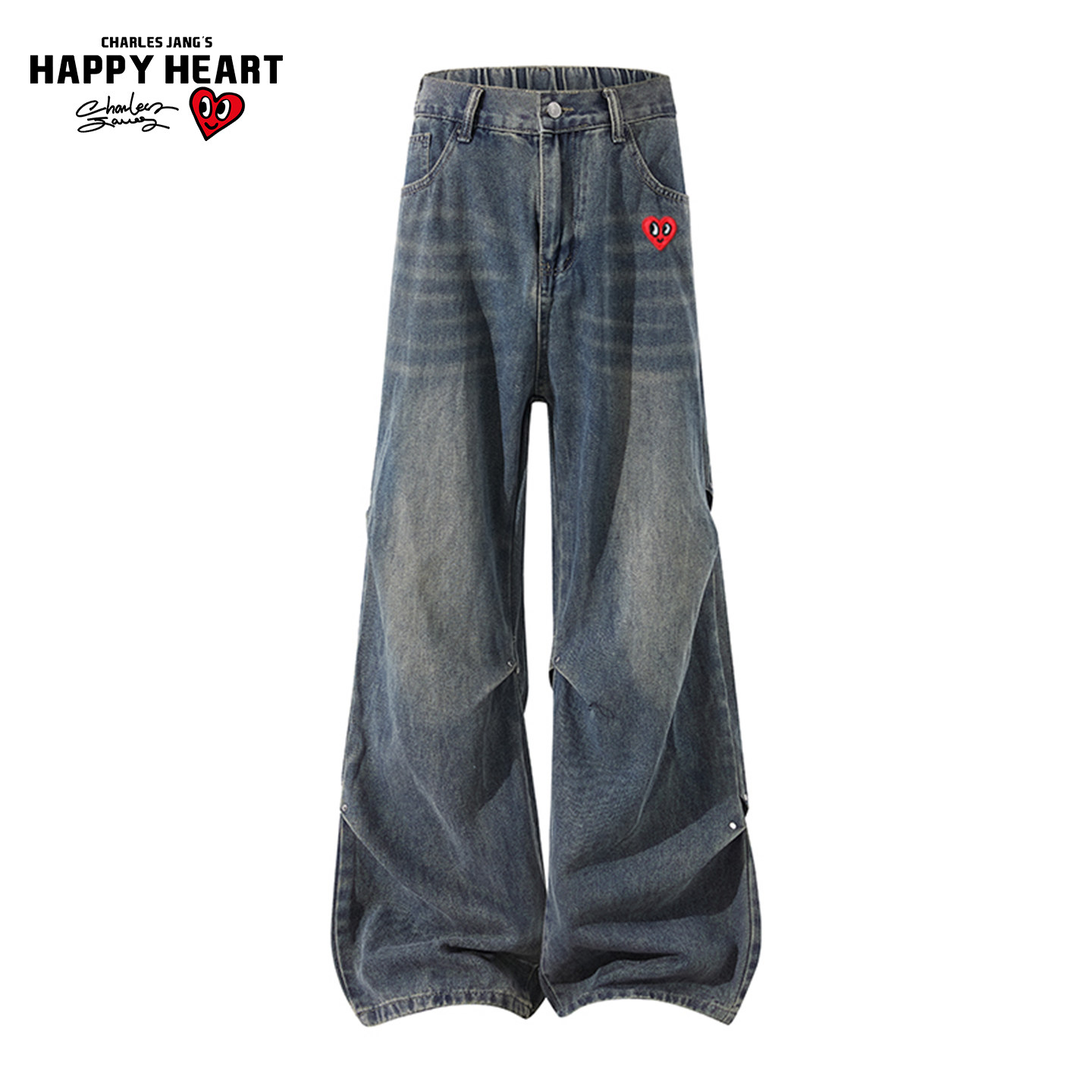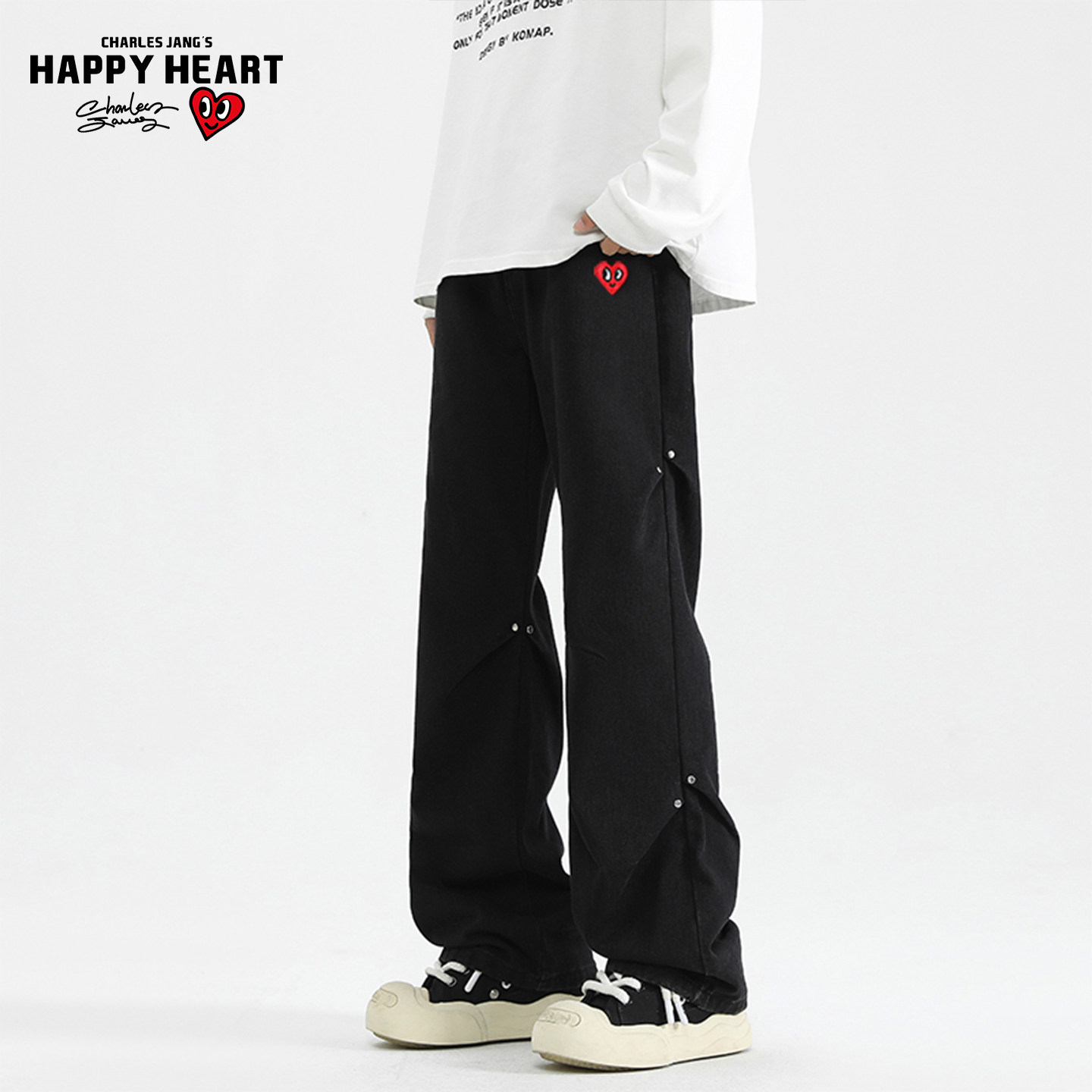 📚 查尔斯桃心复古牛仔裤男秋冬季铆钉拼接设计感磨白水洗阔腿长裤子