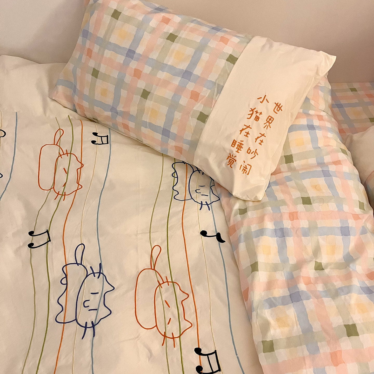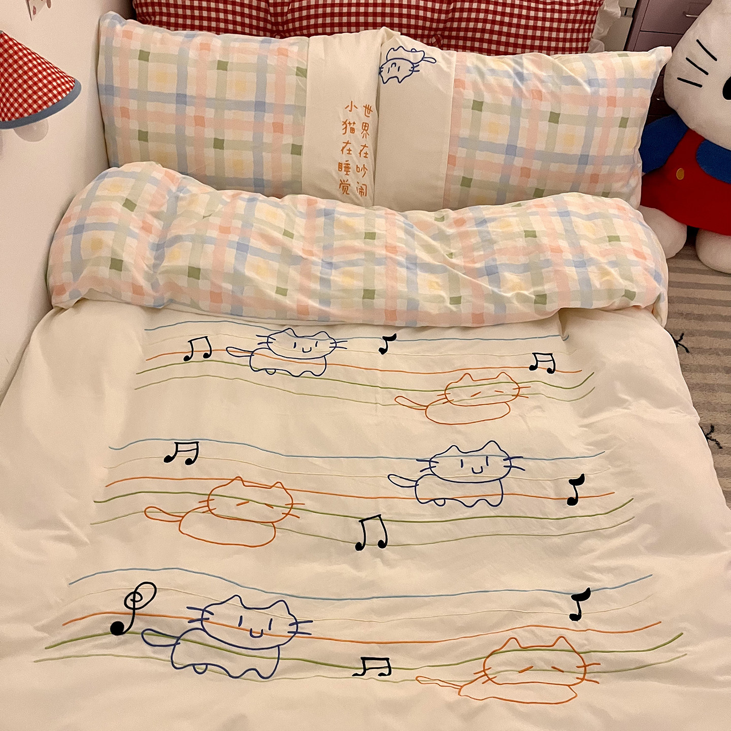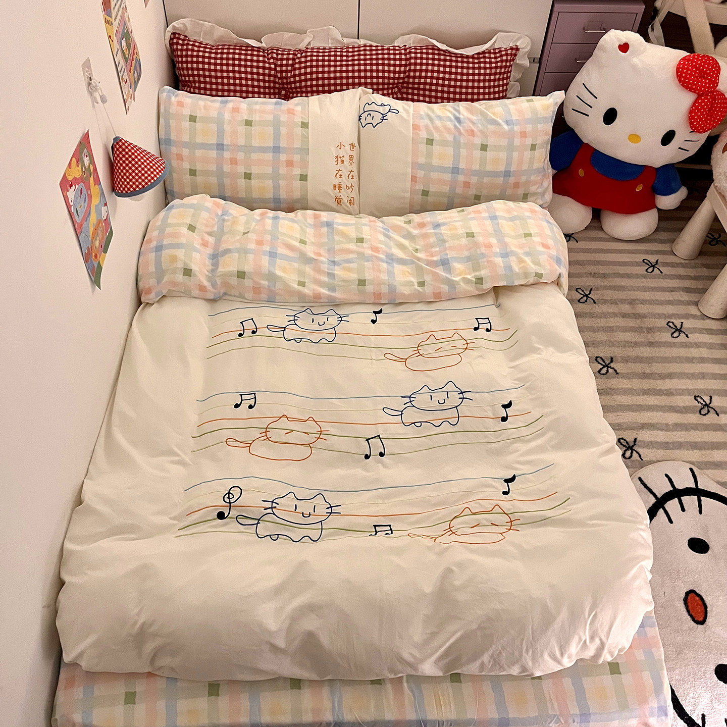 📚 晚安猫少女心混搭乐谱小猫水洗棉四件套学生宿舍三件套磨毛床品