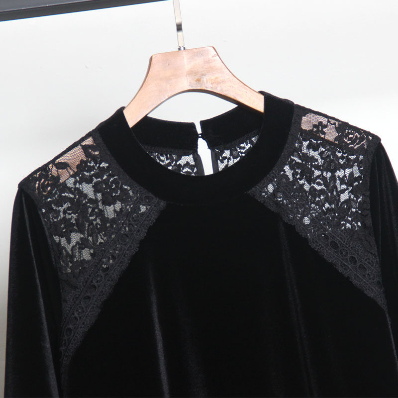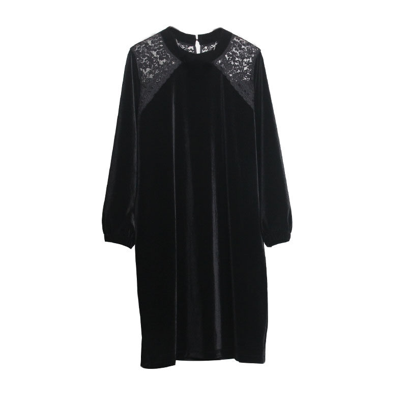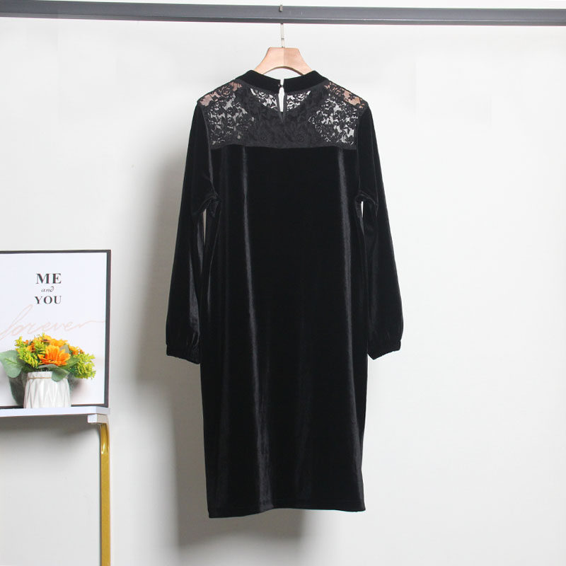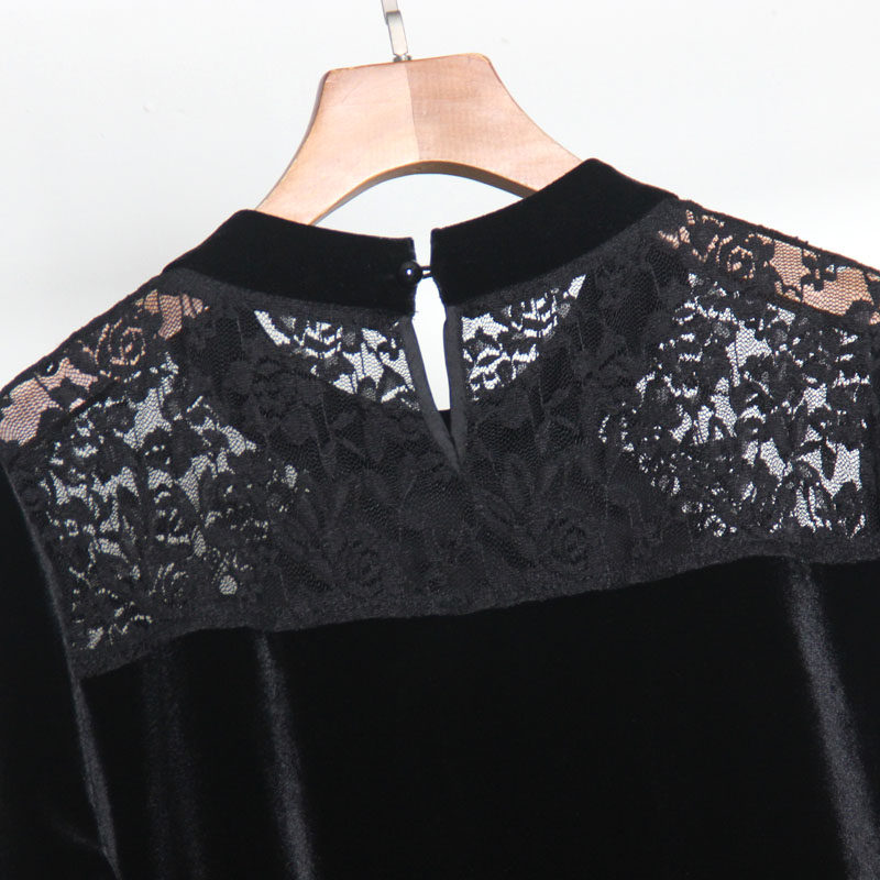 📚 春秋新款立领长袖中长款高端金丝绒连衣裙气质名媛拼接蕾丝直筒裙