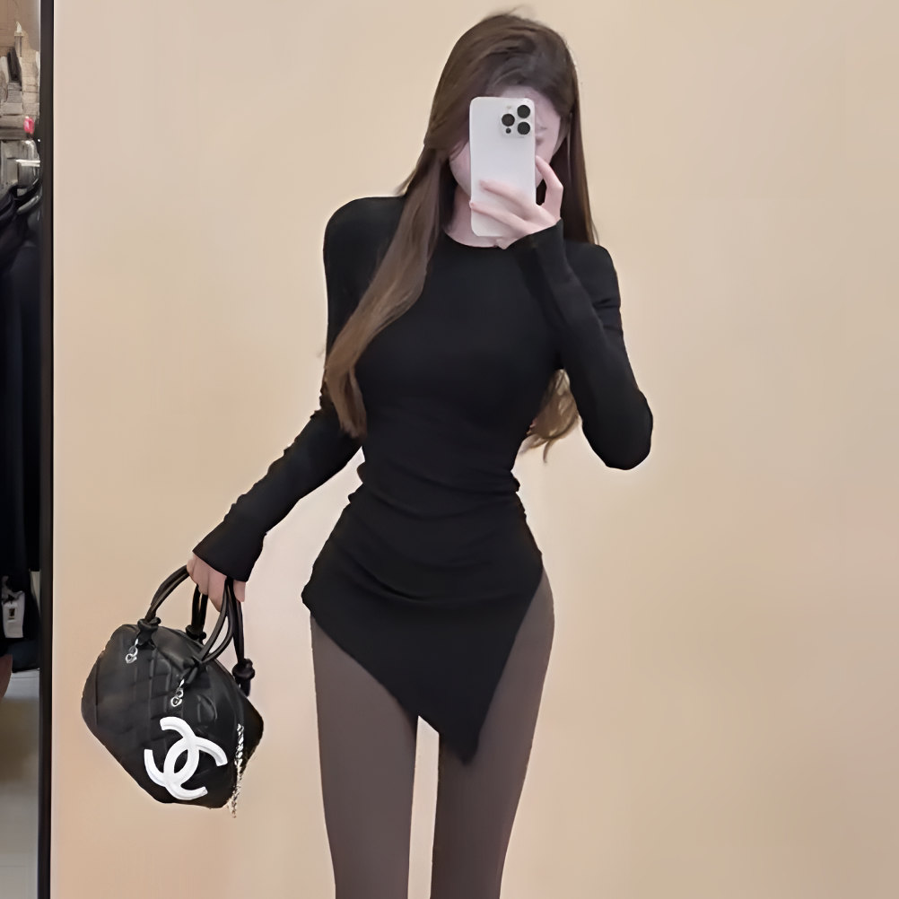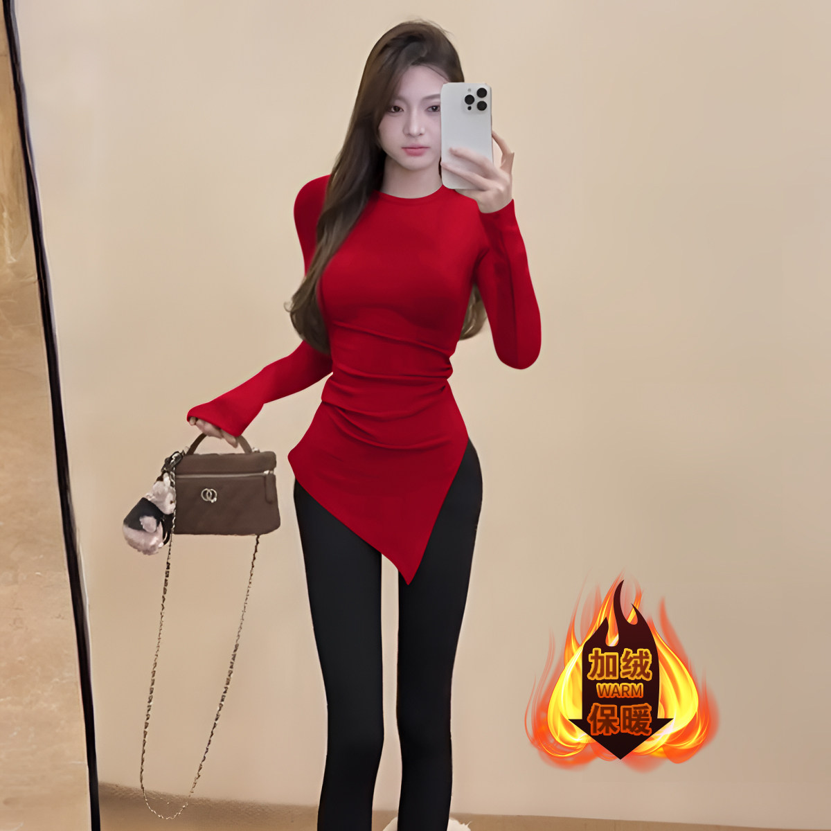 📚 春秋冬季纯欲风中长款不规则加绒打底衫女辣妹设计感修身显瘦上衣