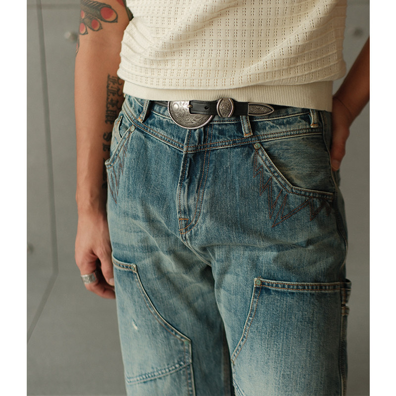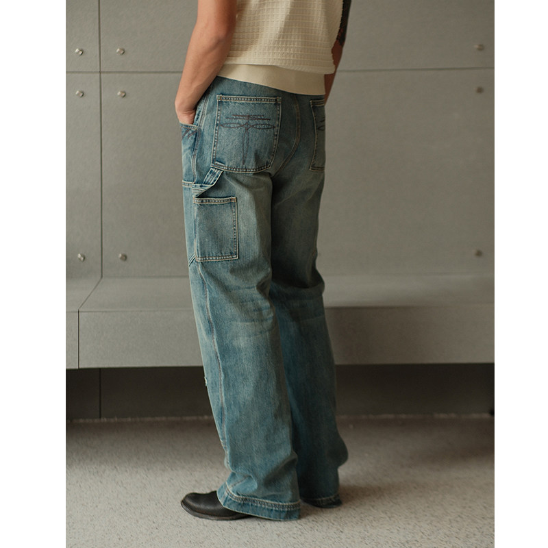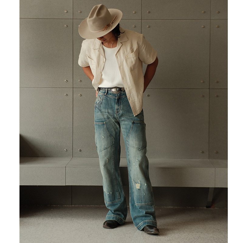 📚 西部系列双膝伐木工15OZ破坏水洗赤耳丹宁阔腿牛仔裤 MBBCAR窄幅