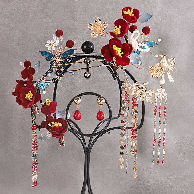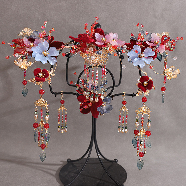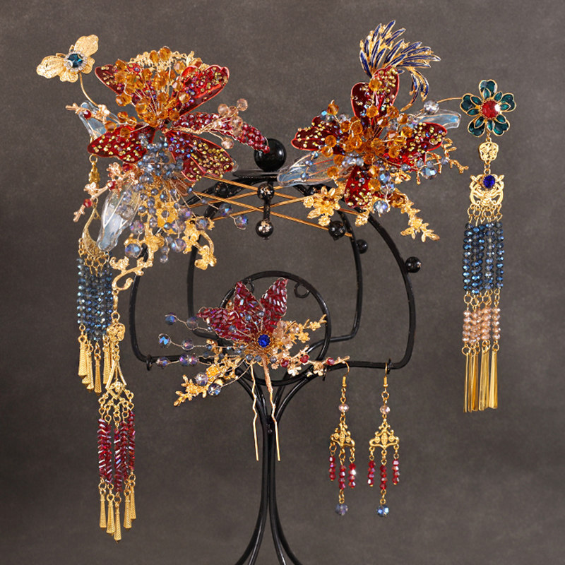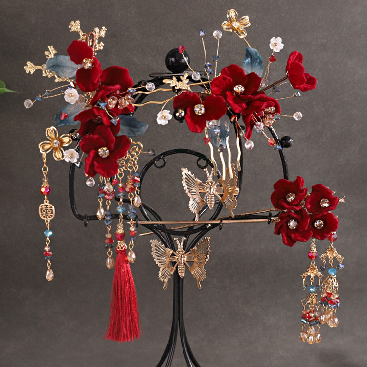 📚 新款减龄新娘头饰秀禾服红蓝中式古典古风花朵流苏蝴蝶发簪发饰品