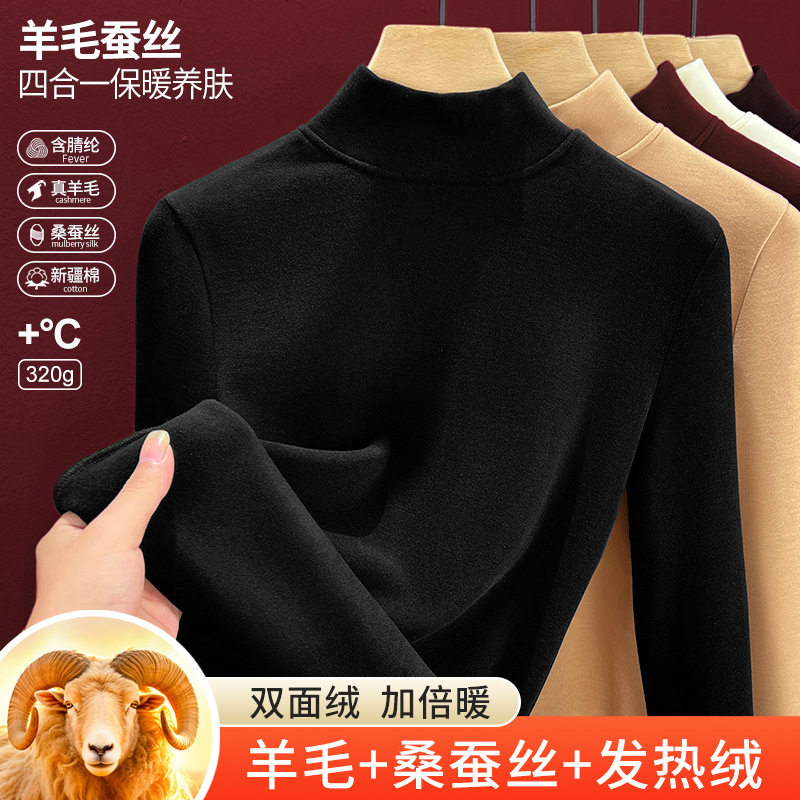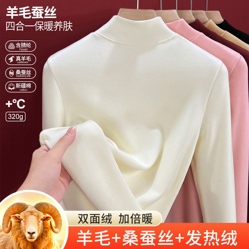 📚 蚕丝羊绒双面德绒半高领打底衫女秋冬季加绒加厚保暖洋气长袖上衣