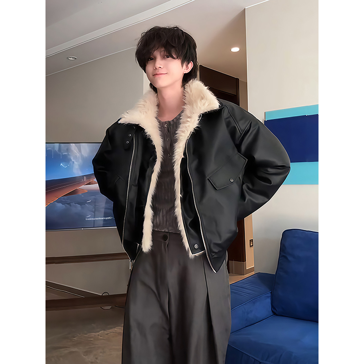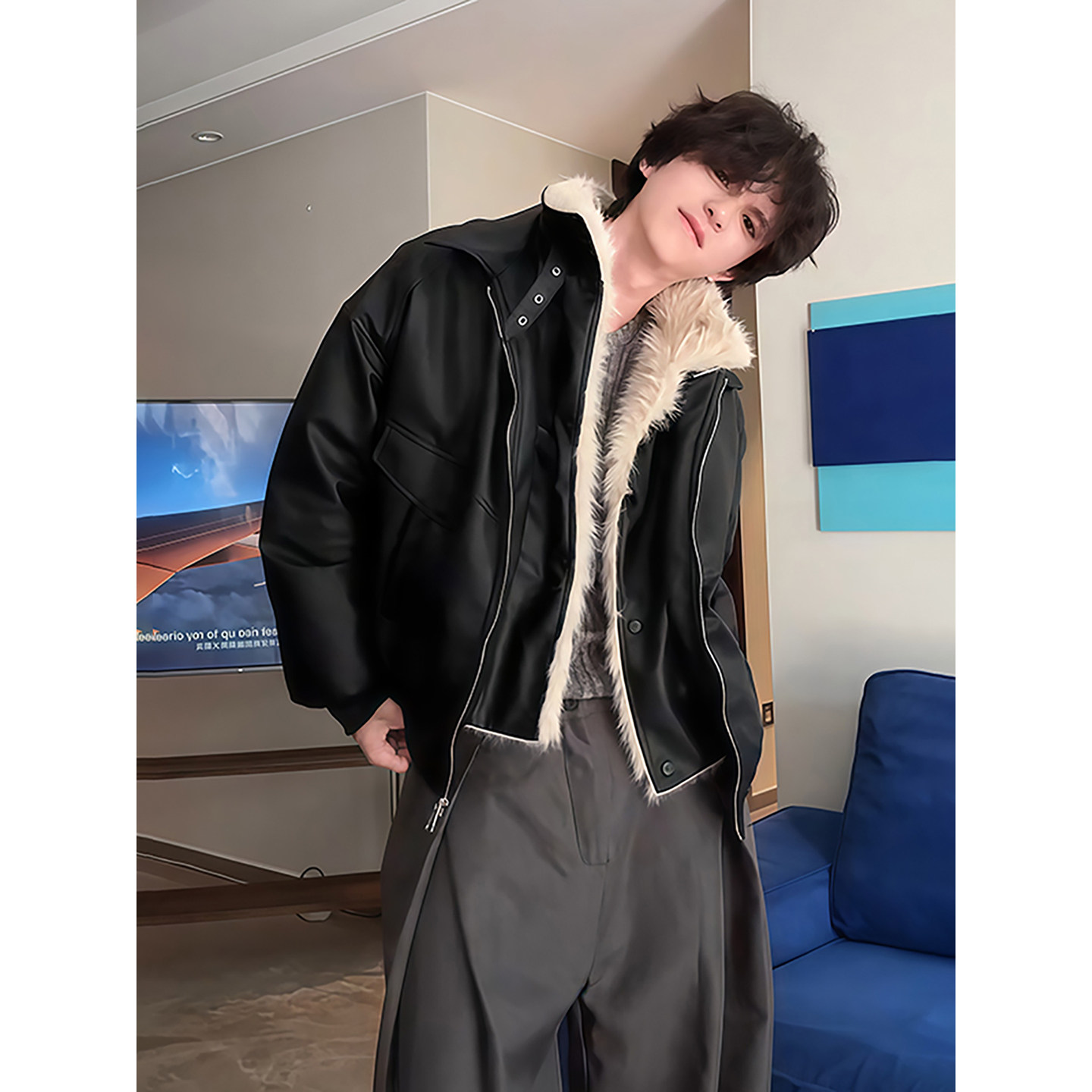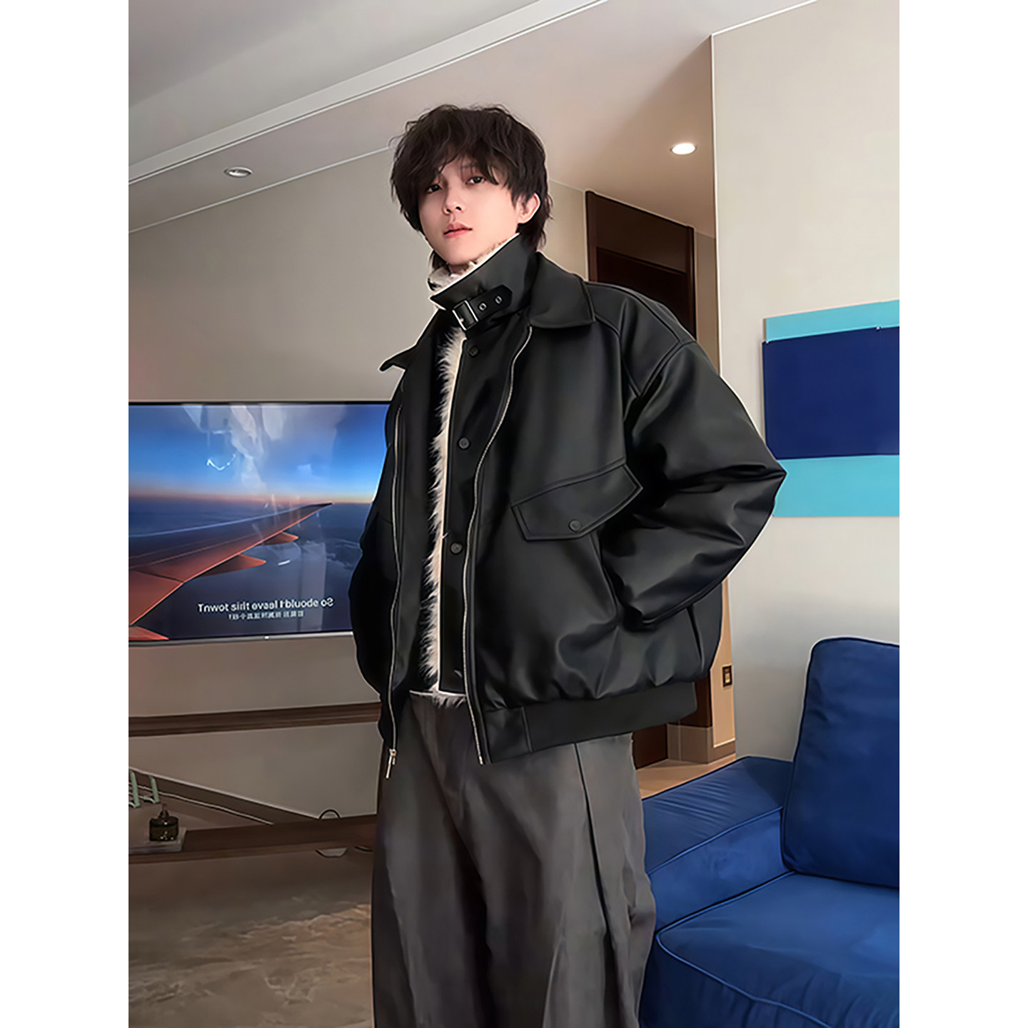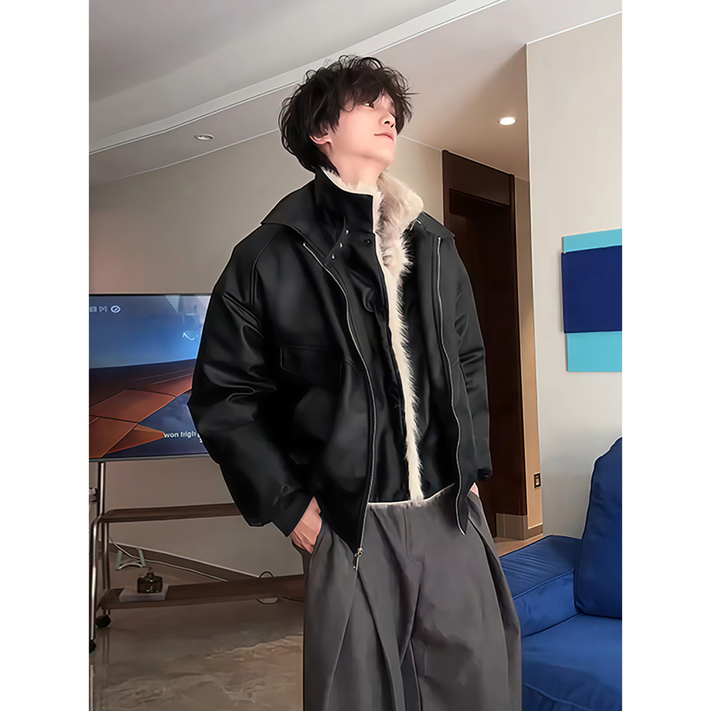 📚 美式复古座山雕皮面棉服男款冬季加厚双层领皮毛一体立领夹克棉衣