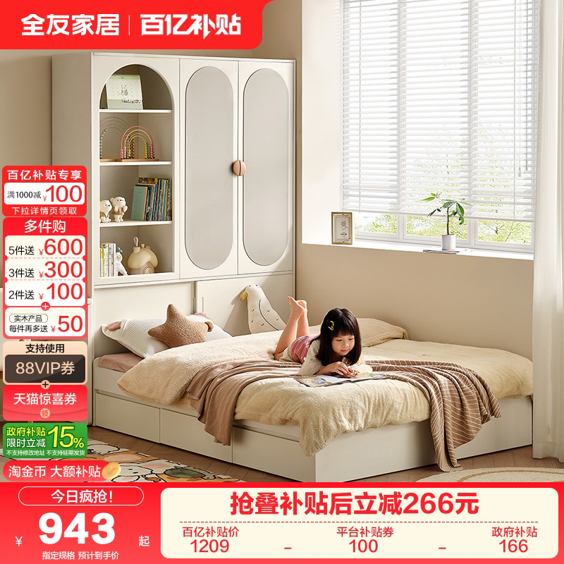 📚 全友家居现代简约榻榻米儿童床储物柜一体无床头地台床卧室衣柜床