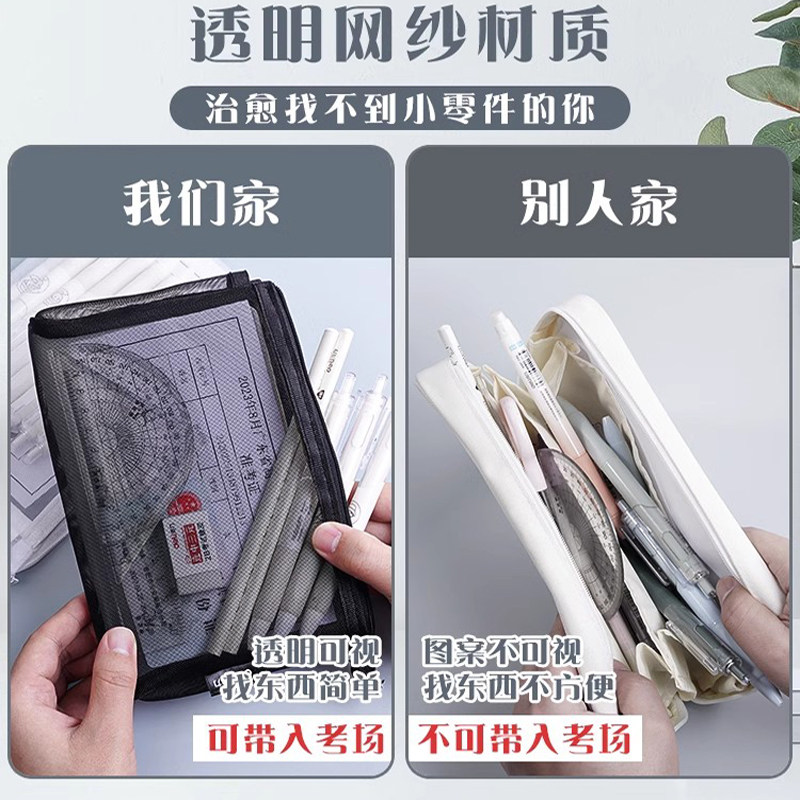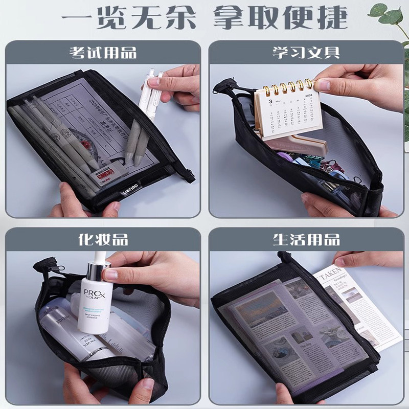 📚 得力透明网纱大容量笔袋收纳袋学生考试专用便携铅笔袋文具袋办公纱网文具盒铅笔袋可带入考场ins日系简约