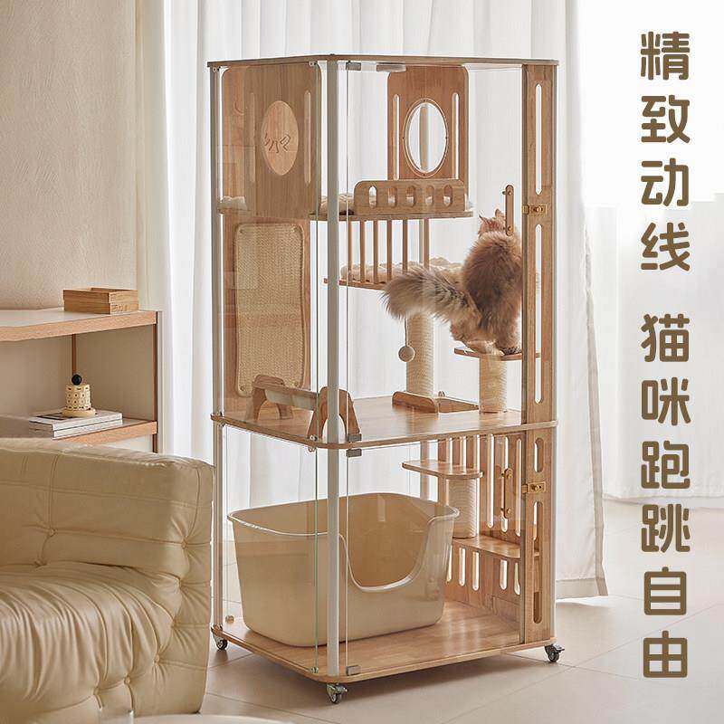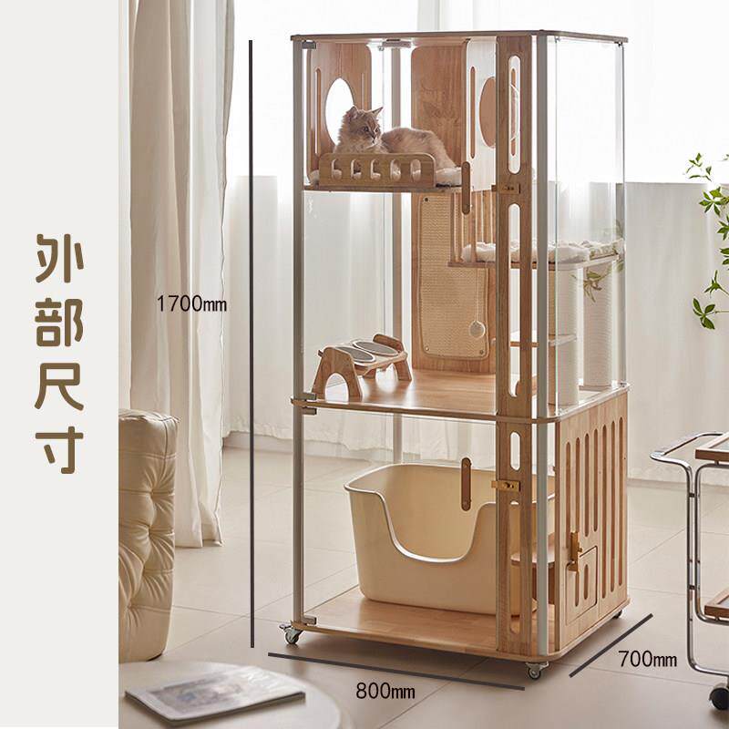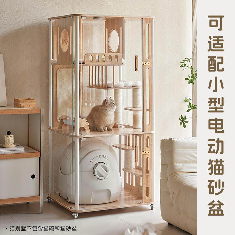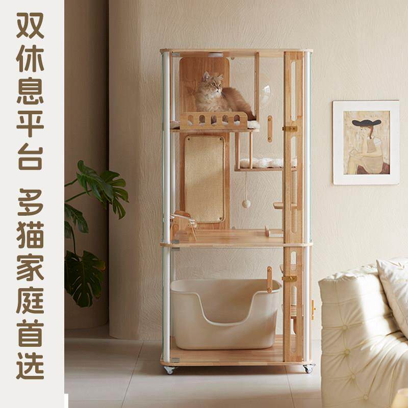 📚 香港包邮哩屋星屿系列实木全景猫别墅可放自动猫砂盆钢化玻璃木质