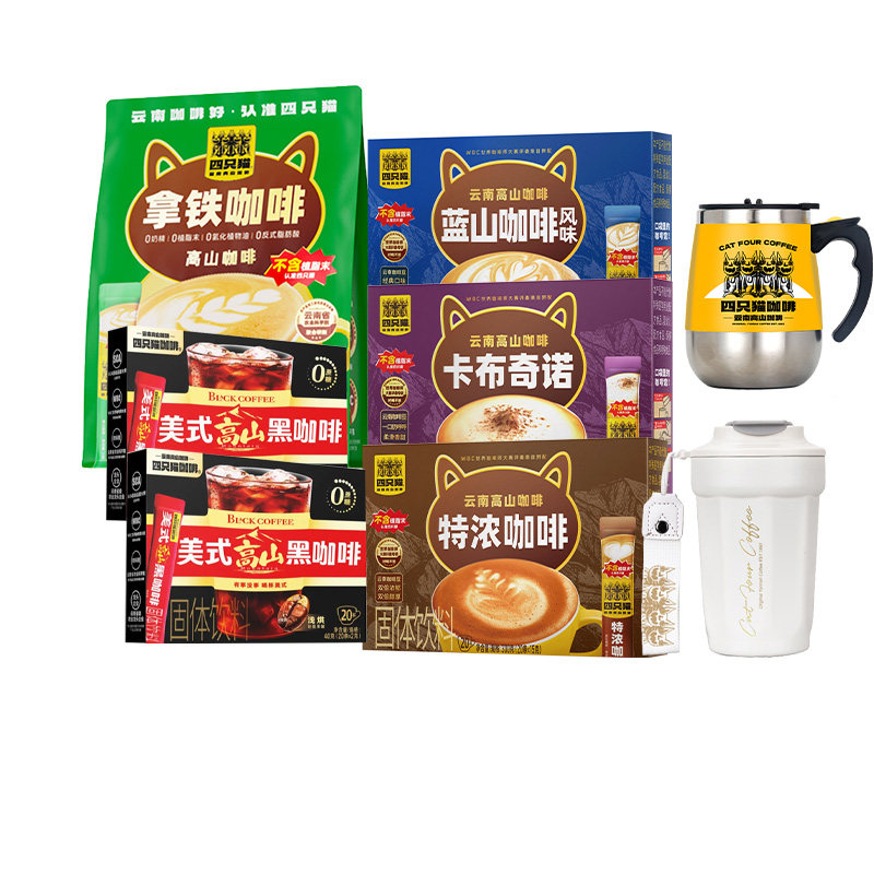 📚 四只猫 蓝山特浓卡布拿铁美式云南速溶提神咖啡粉送电动搅拌杯