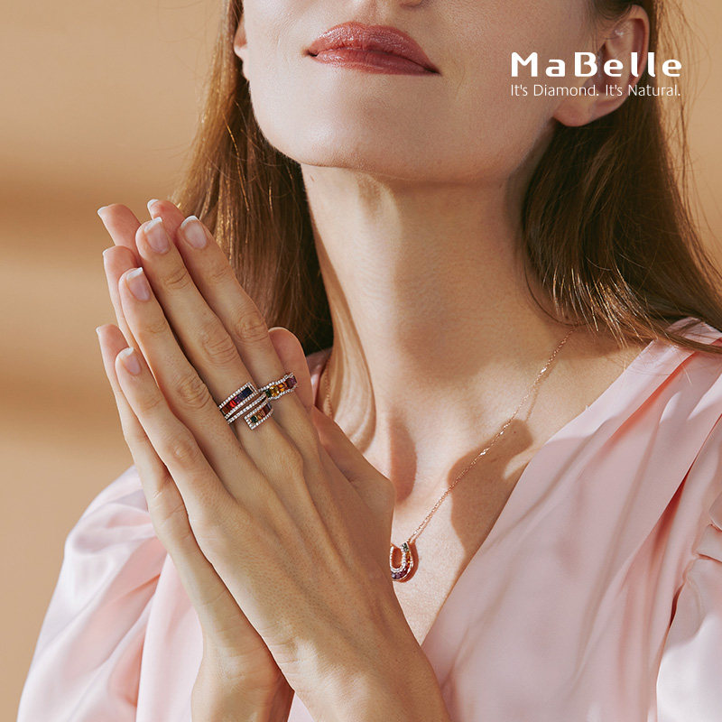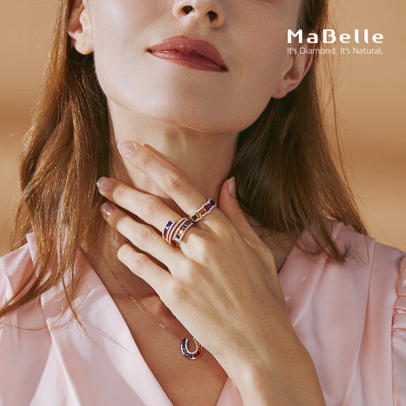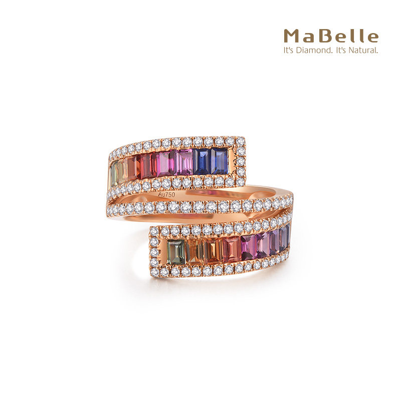 📚 MaBelle/玛贝尔彩虹系列 18K玫瑰金方形彩蓝宝拼镶钻石戒指 时尚