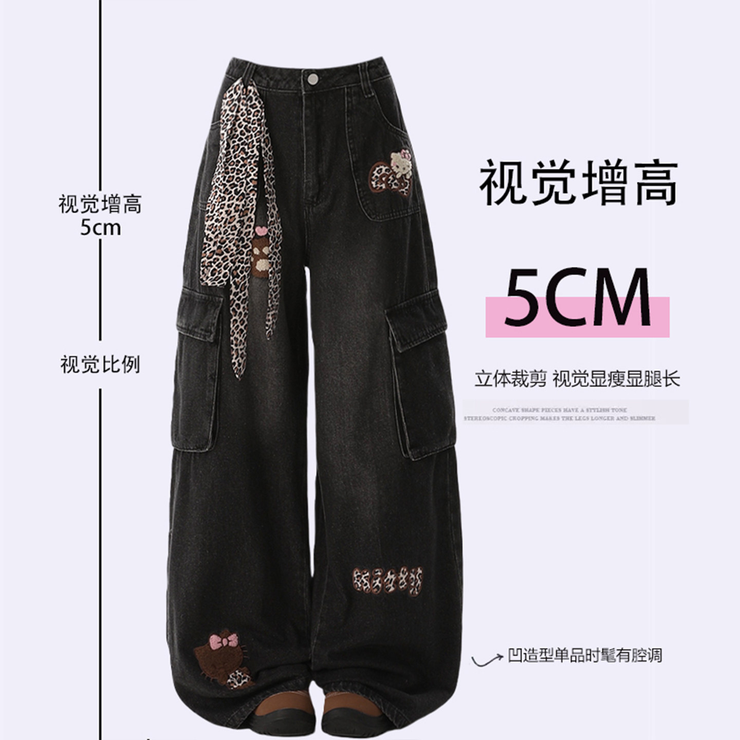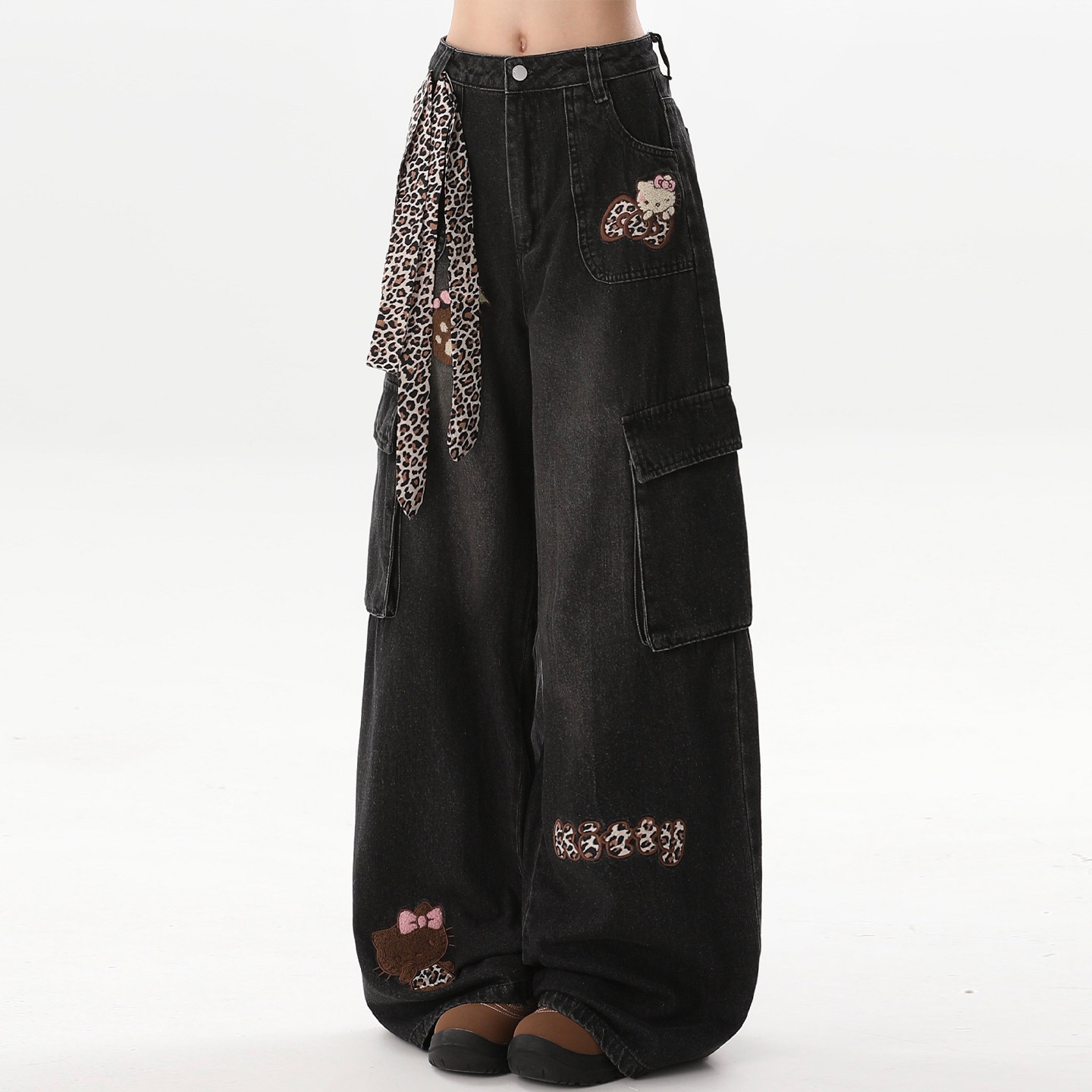 🔥绝美胖mm必入手!300斤特大码美式豹纹刺绣加绒阔腿牛仔裤,黑色高街风长裤💃