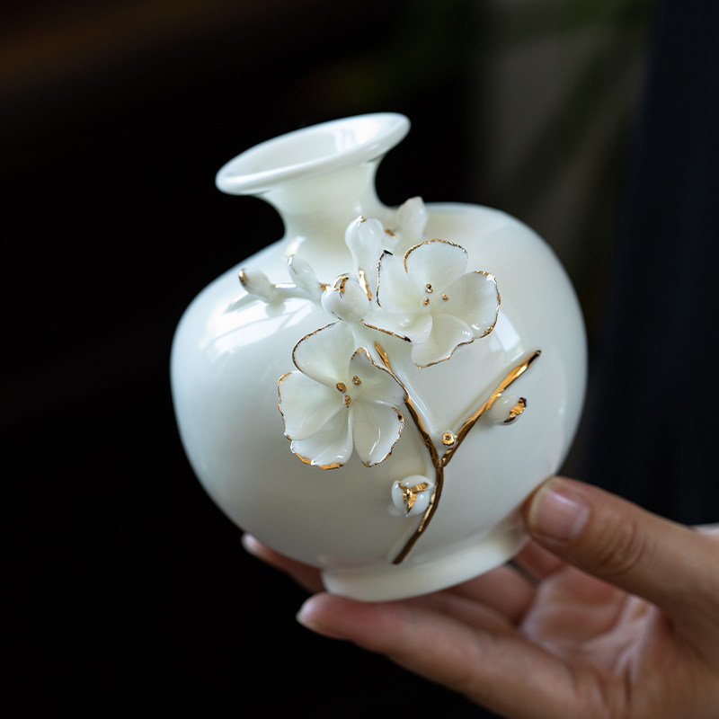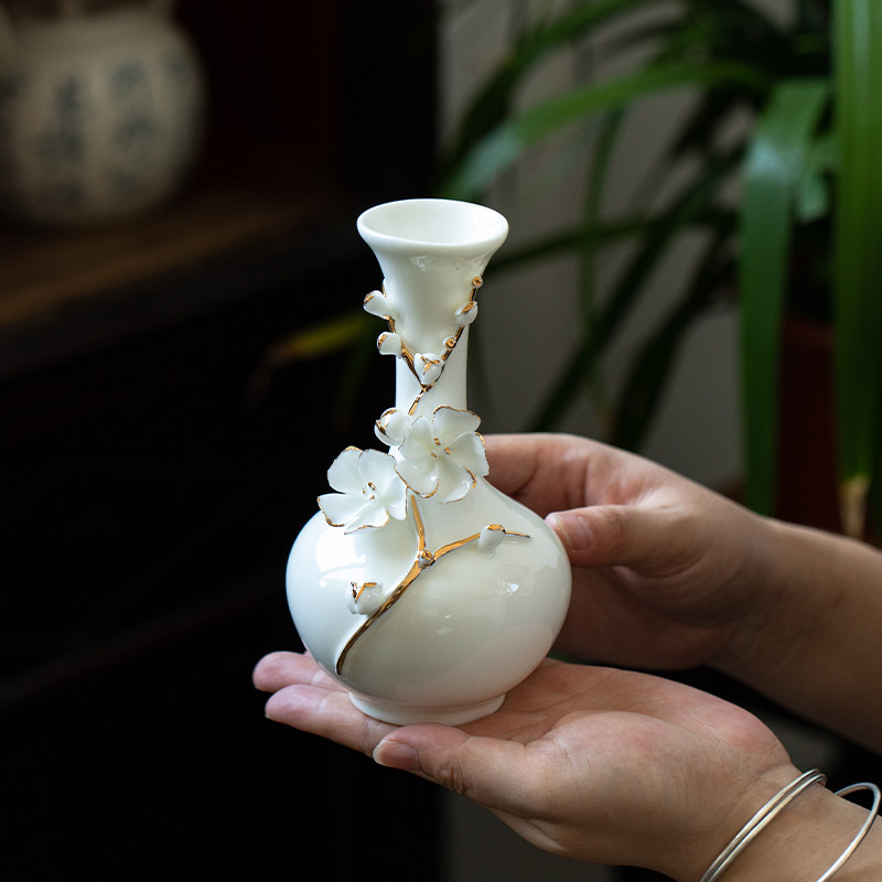 📚 德化羊脂玉瓷手工捏花梅花陶瓷花瓶家居餐桌面插花摆件电视柜花器