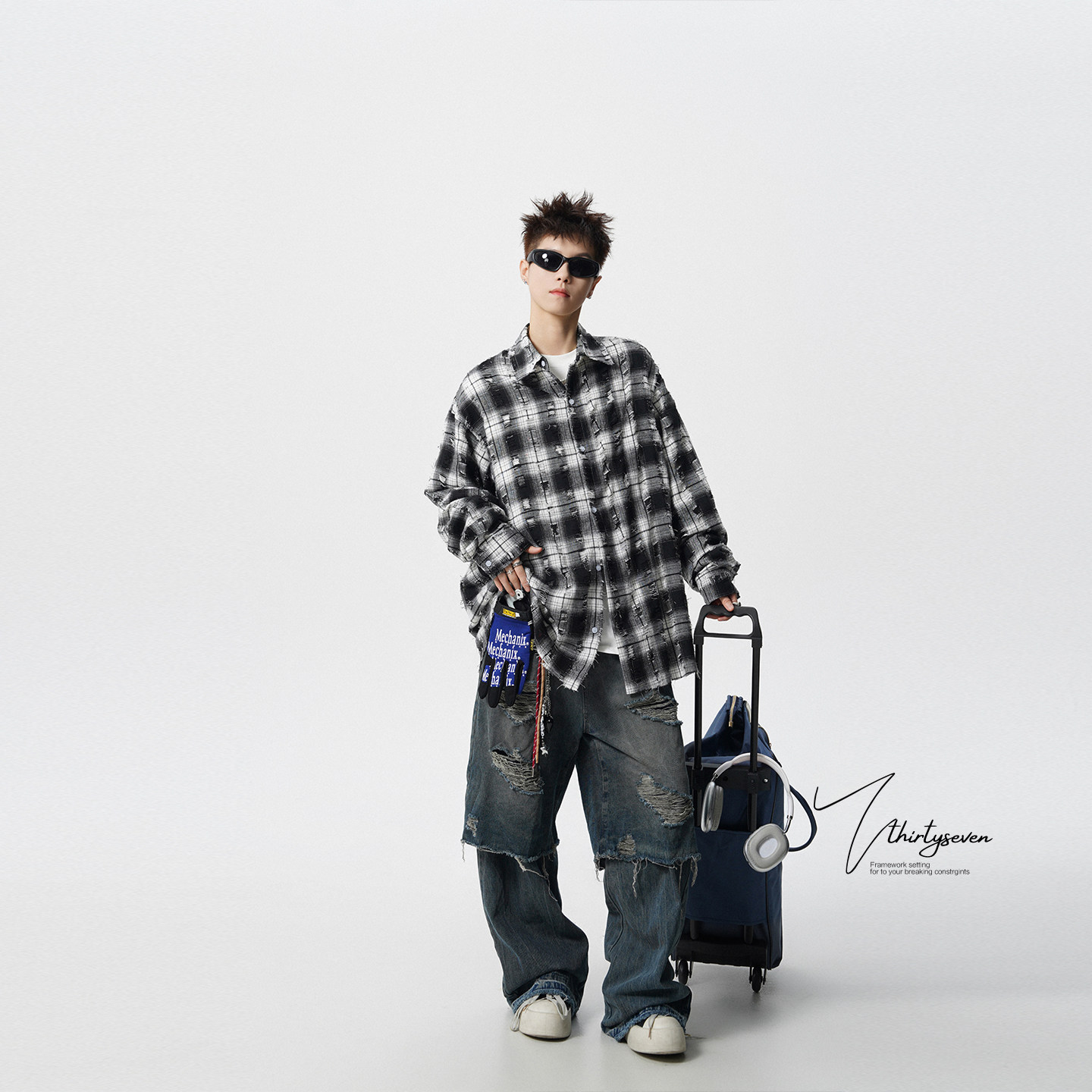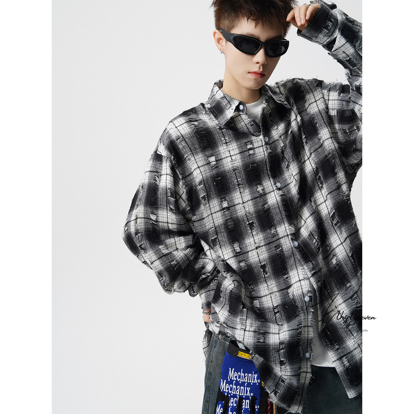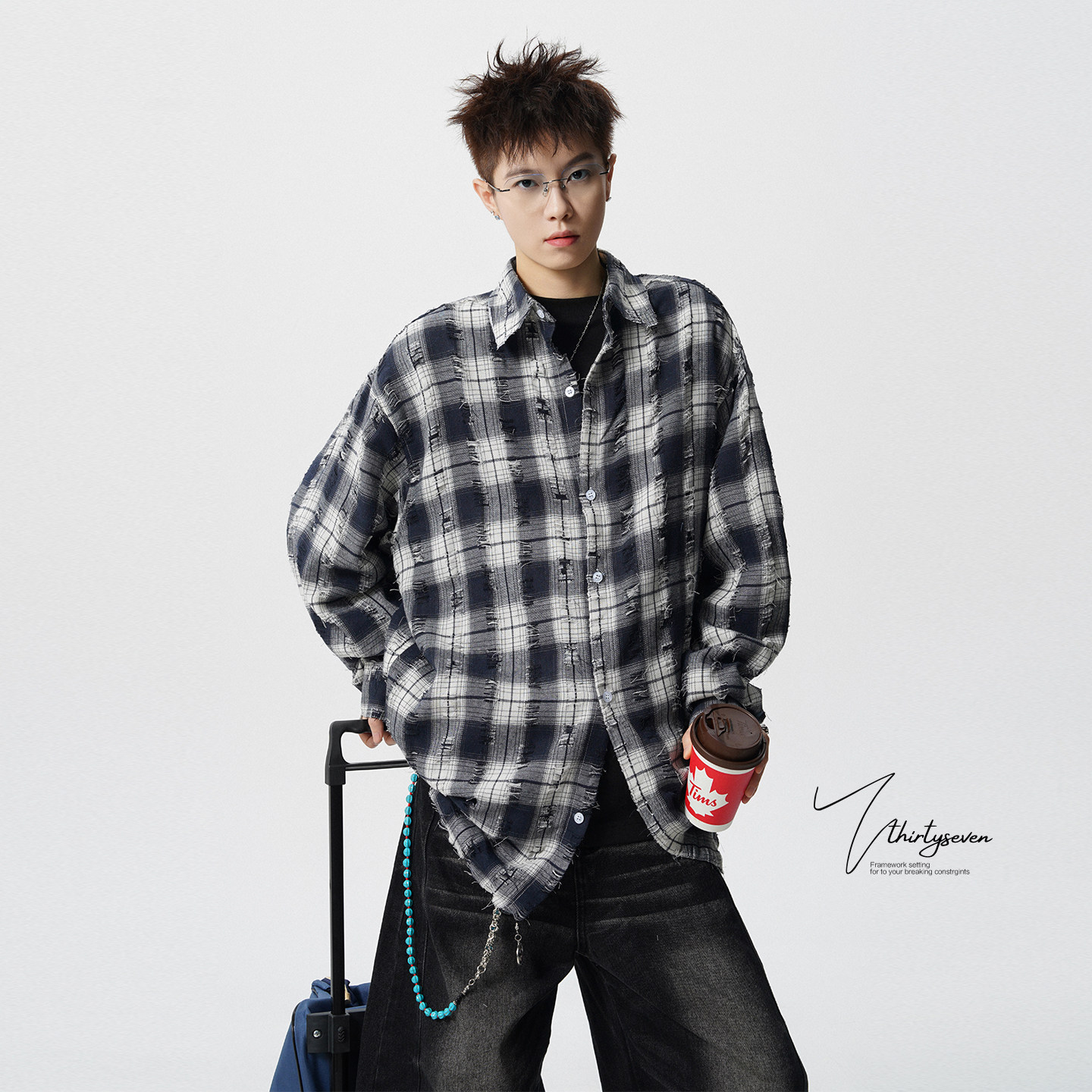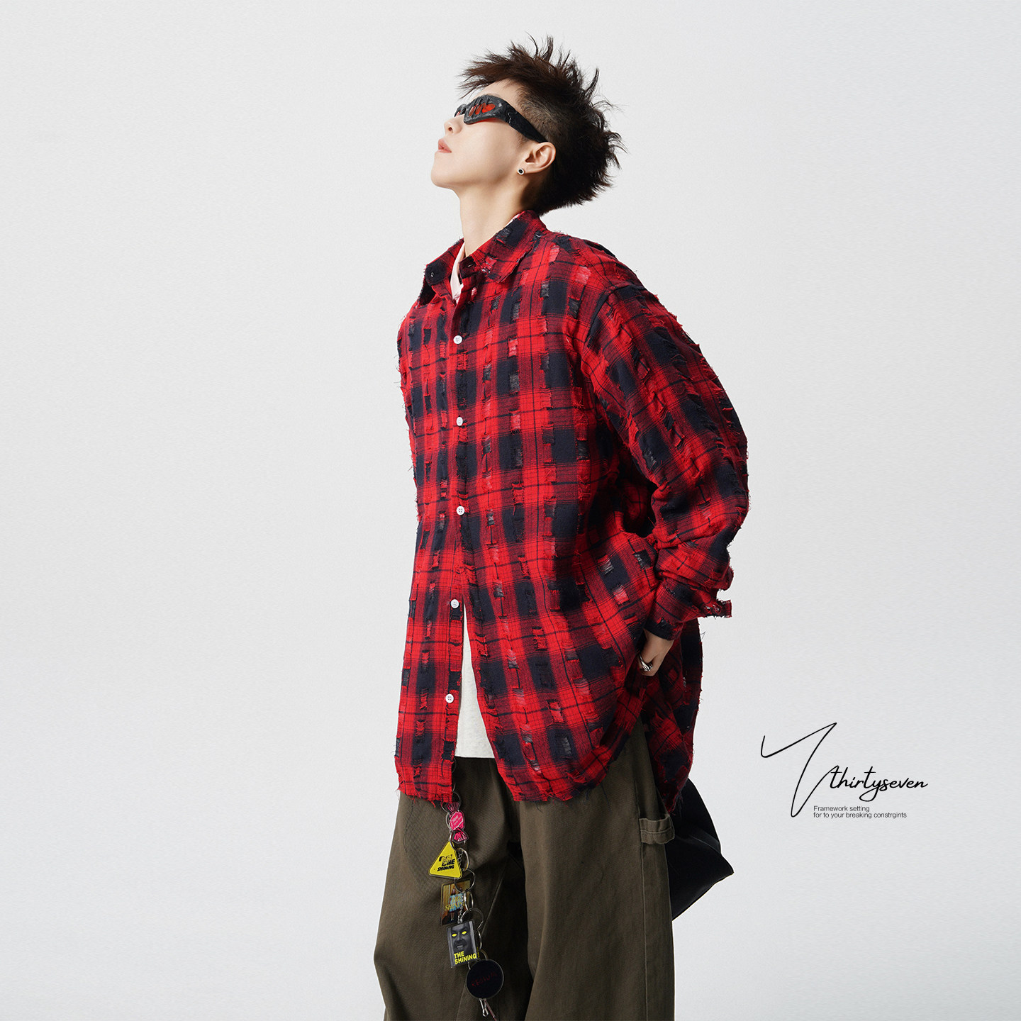 📚 V37美式高街小众破洞红格子衬衫男款春季潮牌慵懒松弛感翻领衬衣