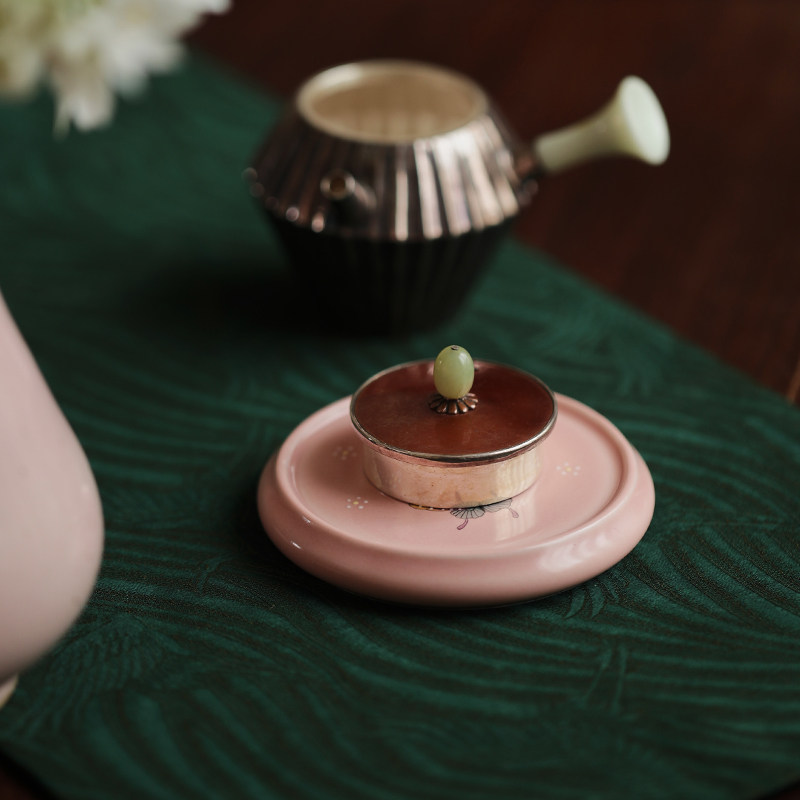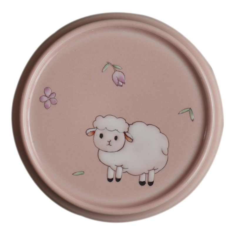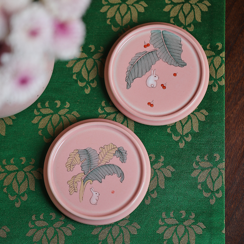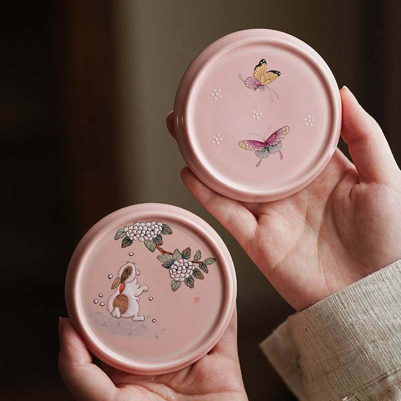 📚 勾画茶器 景德镇手绘粉色兔子盖置可爱杯托盖碗茶壶盖托茶道配件