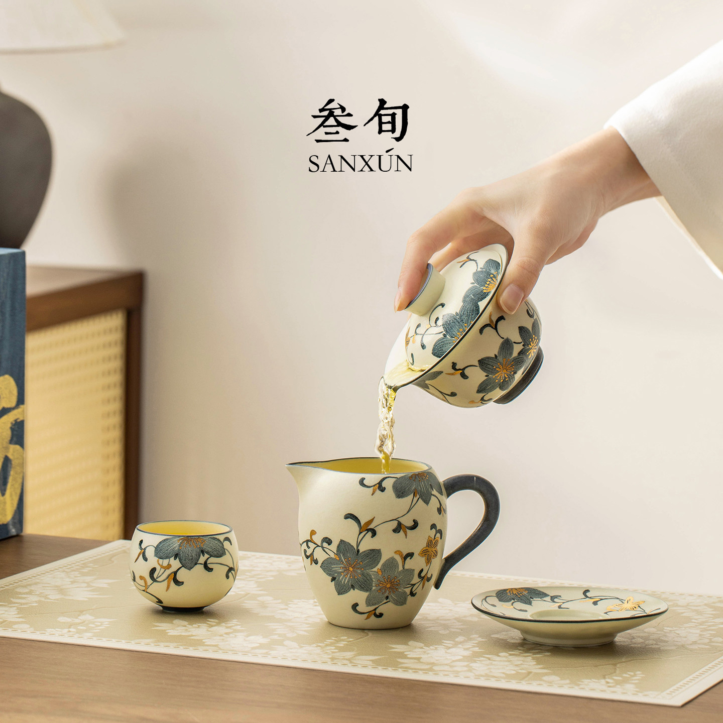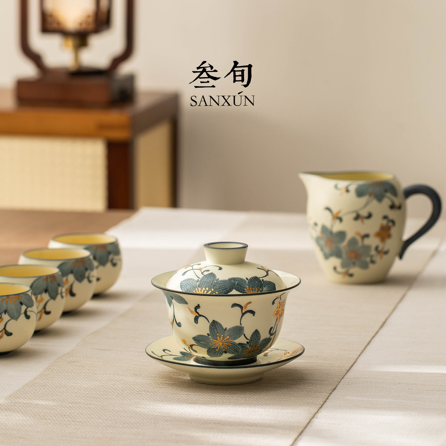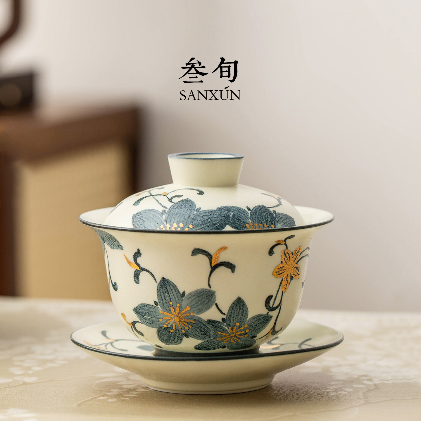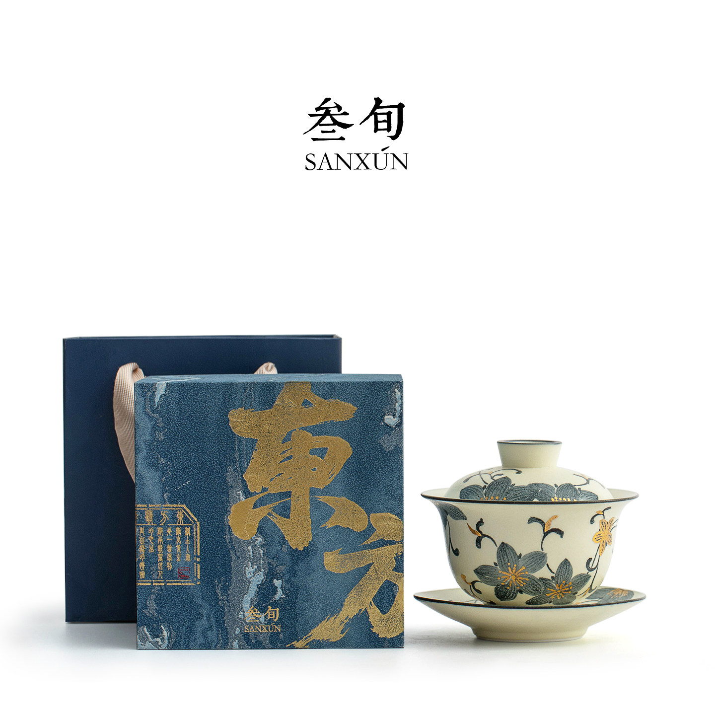 📚 三旬手绘青花缠枝莲三才盖碗茶杯单个高档泡茶碗带盖三件套礼盒装