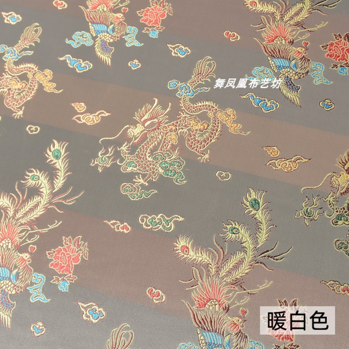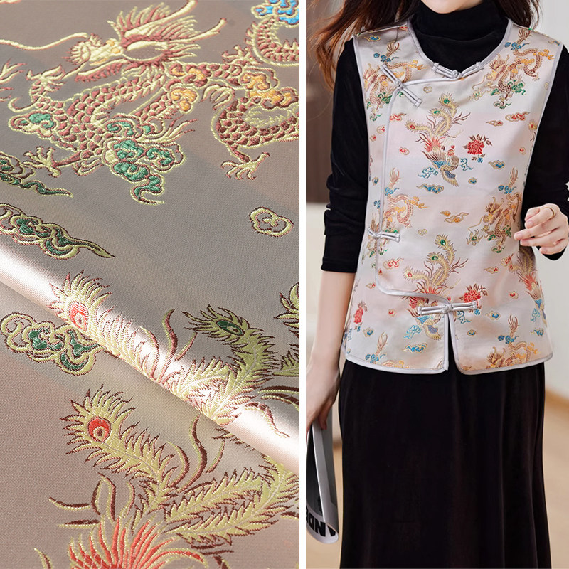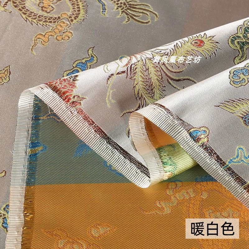 📚 中国风暖白色织锦缎面料 七彩龙凤纹理提花宋锦马甲上衣旗袍布料
