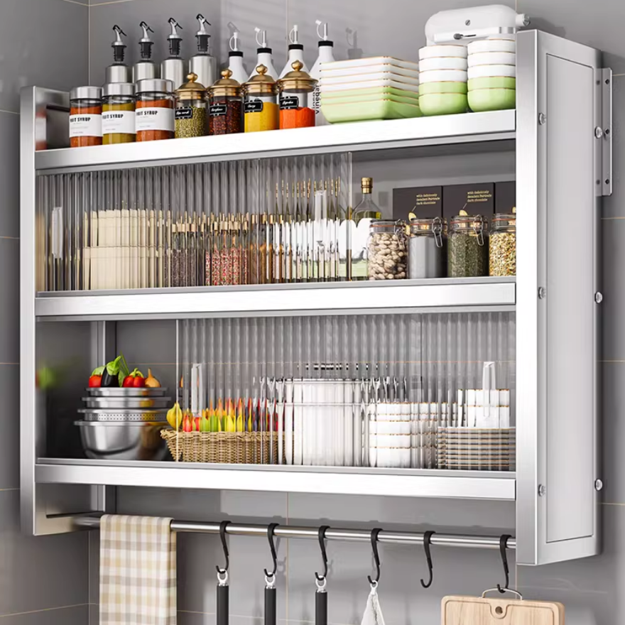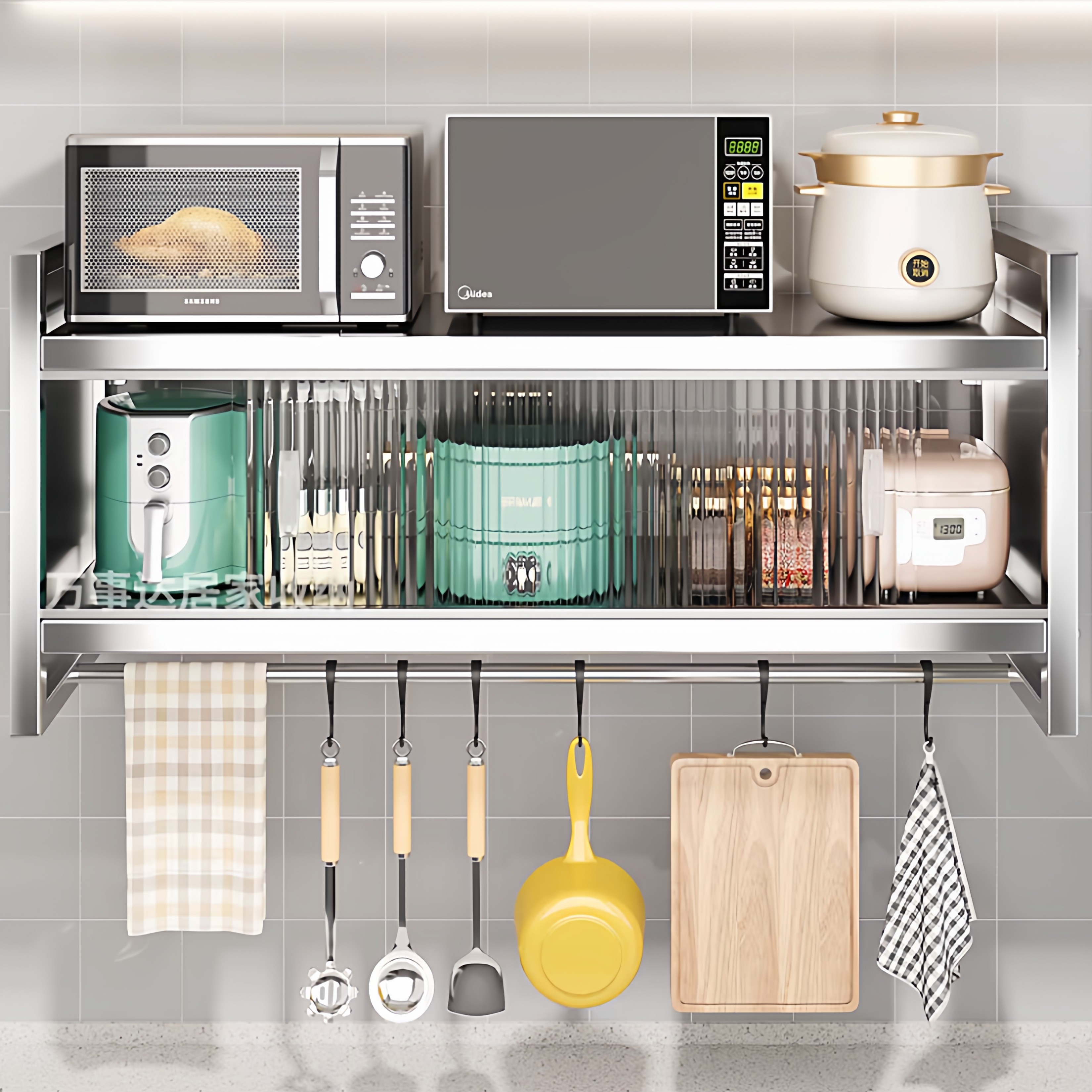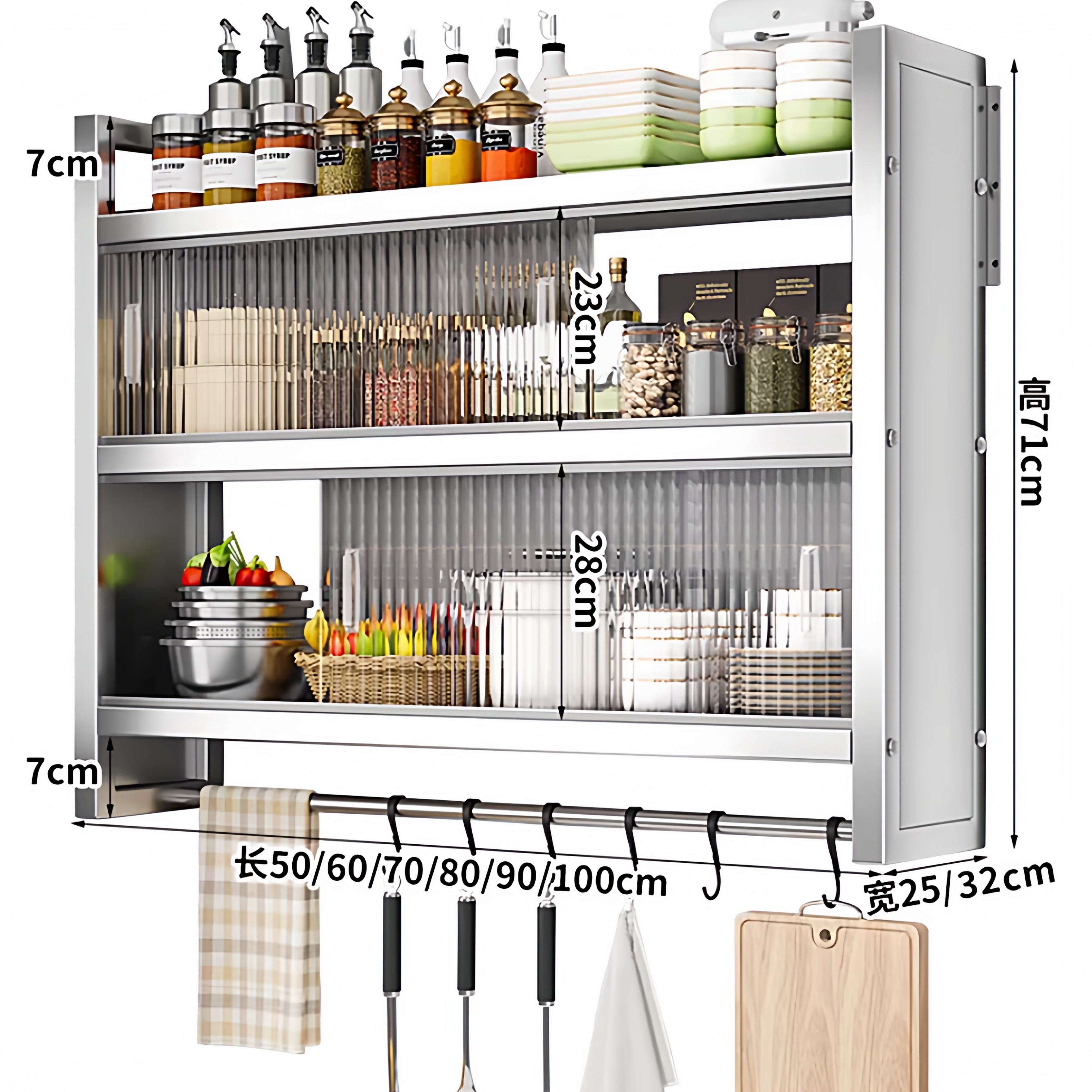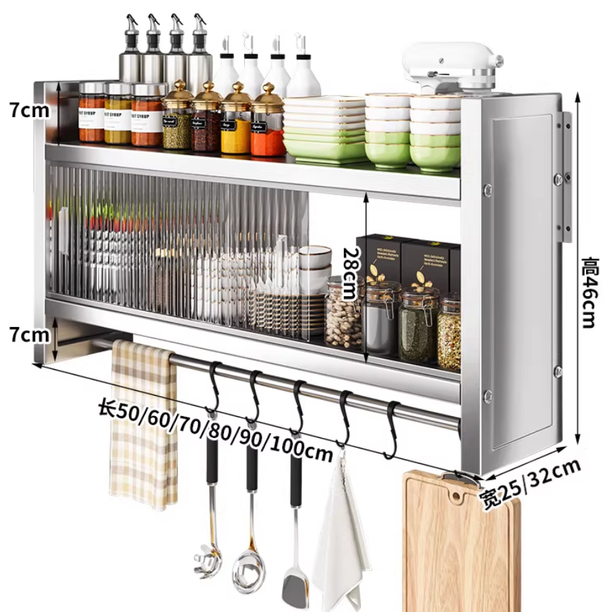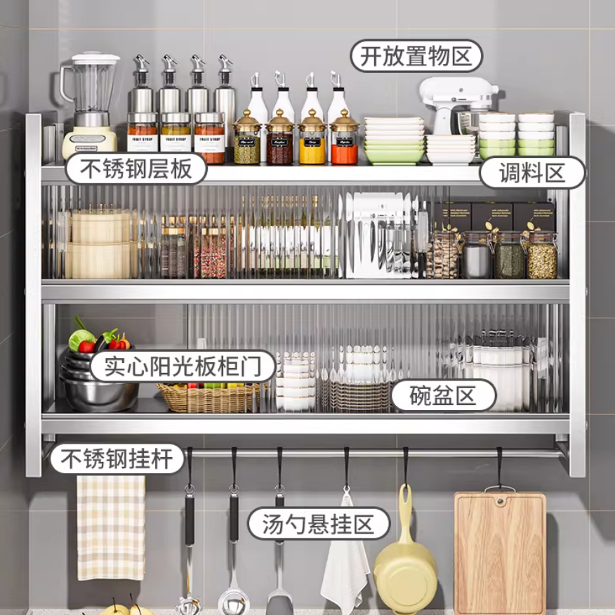 📚 厨房不锈钢壁挂橱柜置物架加厚带推拉门碗柜封闭式家用上墙免打孔