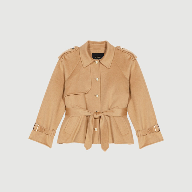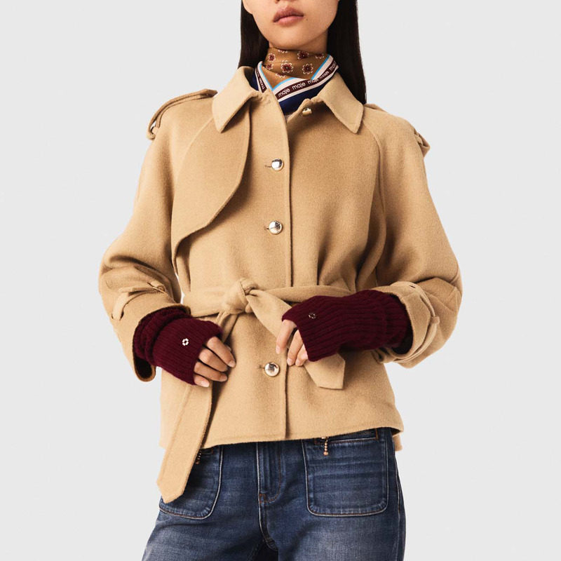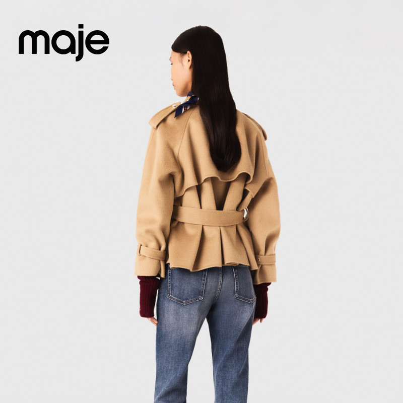 📚 季末6折Maje2025秋冬款女装法式气质驼色系带收腰单排扣毛呢外套