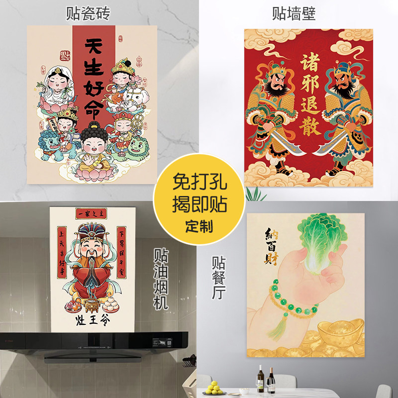 📚 灶王爷油烟机贴纸自粘防水防油厨房装饰画新年灶神年画高档定制