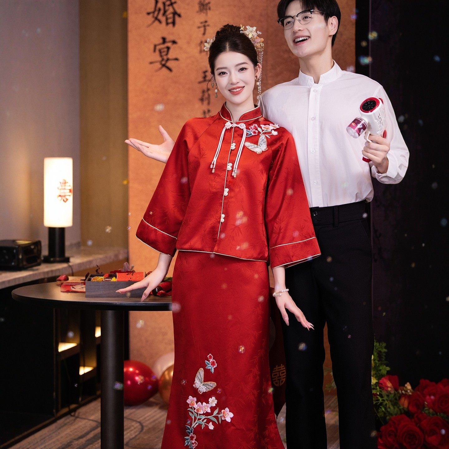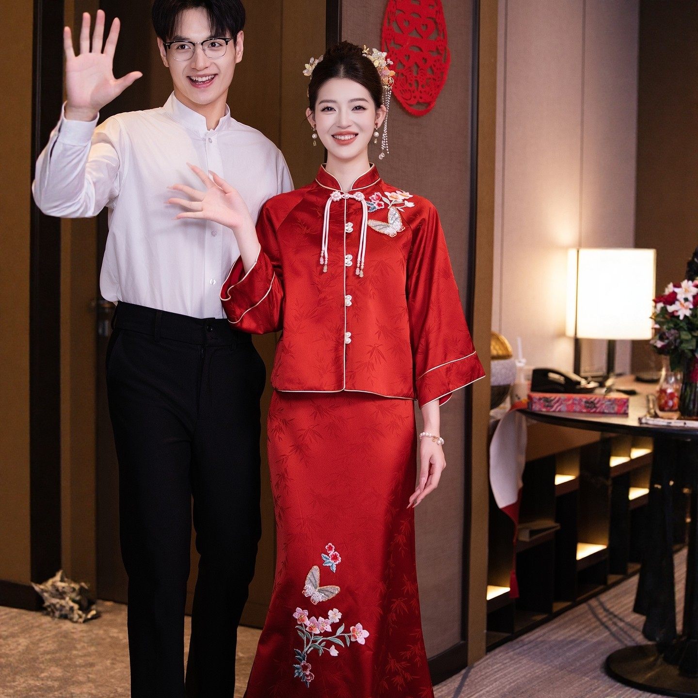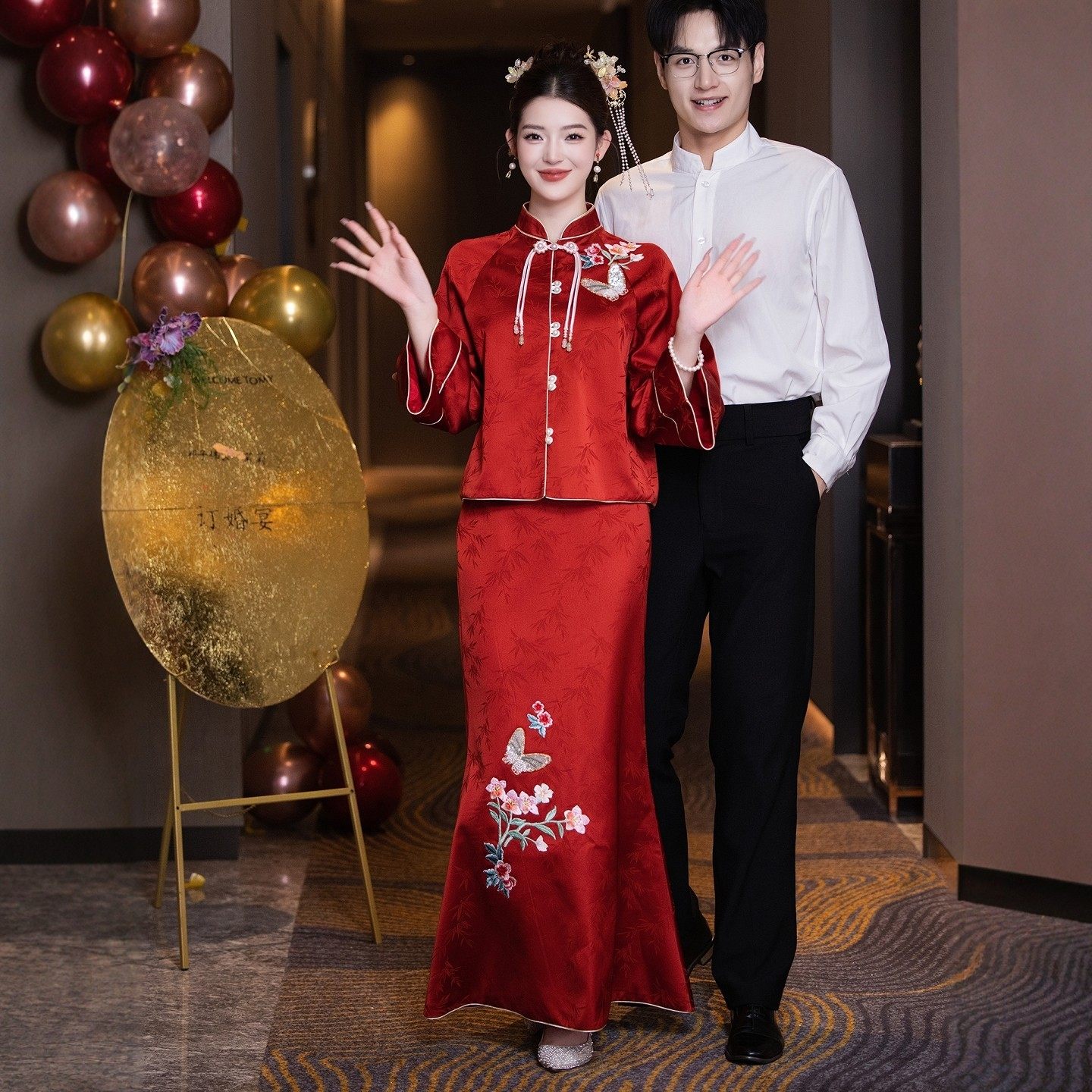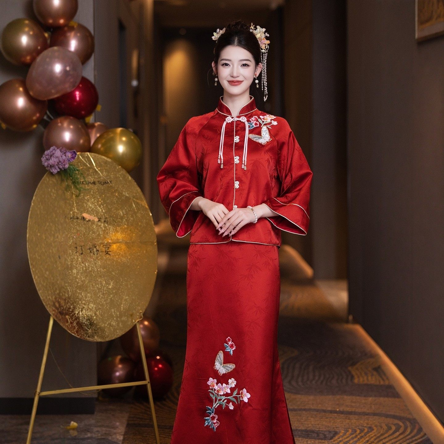 📚 海棠记红色旗袍敬酒服新娘订婚礼服裙女结婚便装中式套装长袖刺绣