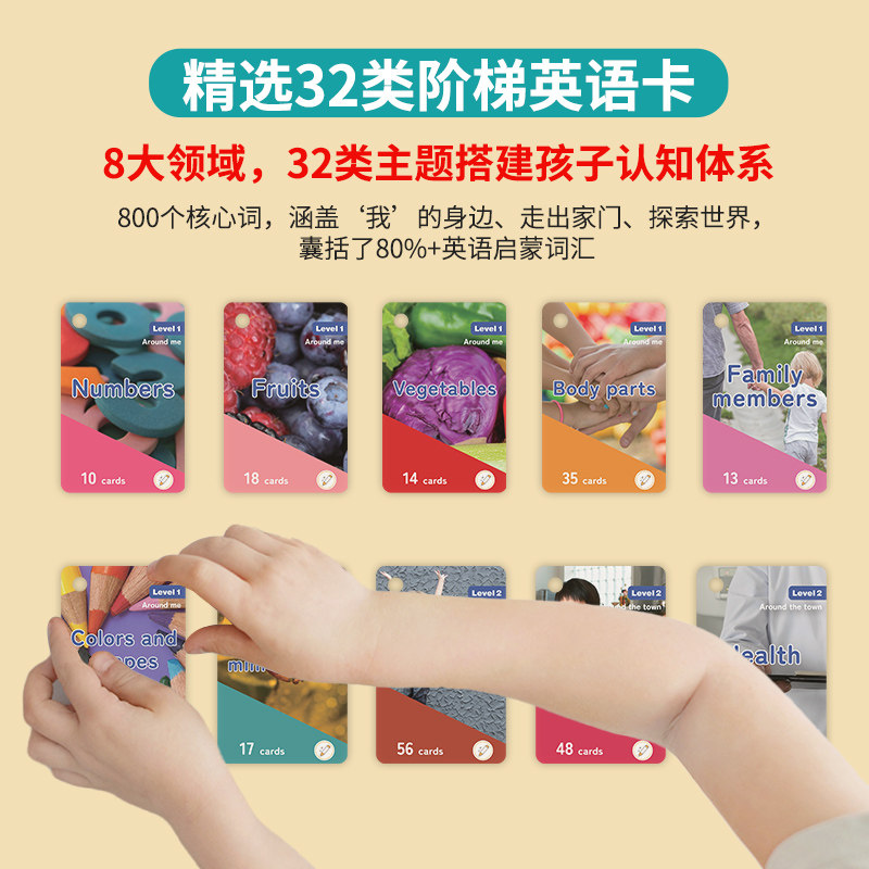 🌈一拿到这款产品,我就被它的颜值深深吸引!😍卡片的色彩丰富,设计简洁大方,非常适合儿童的审美。而且这款卡片的种类丰富,涵盖了32类26个小达人爱学的英语单词,非常适合孩子们进行英语启蒙。