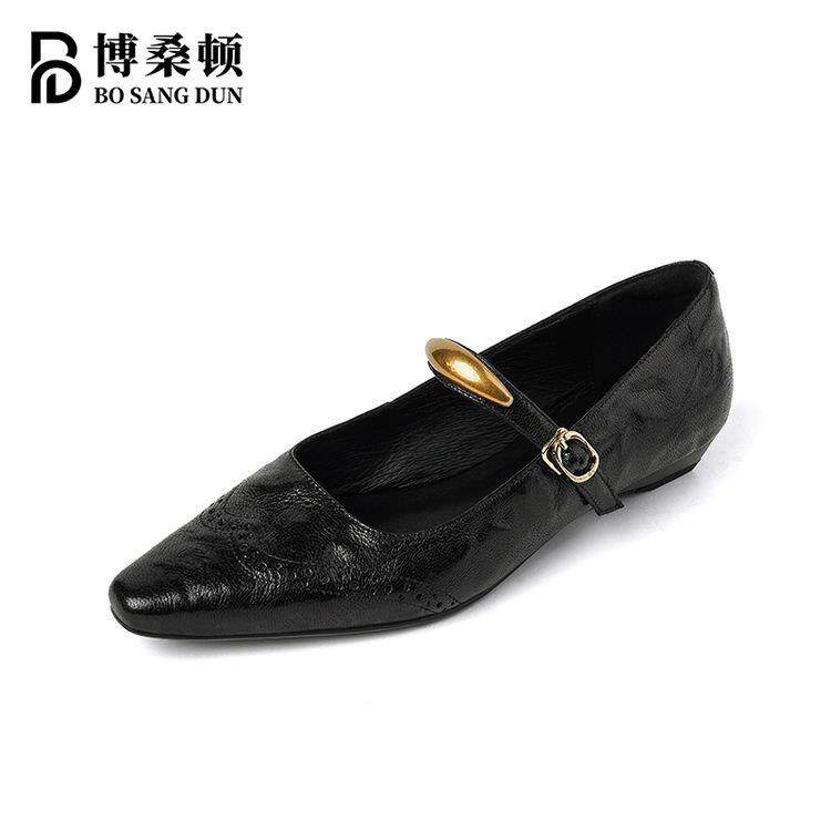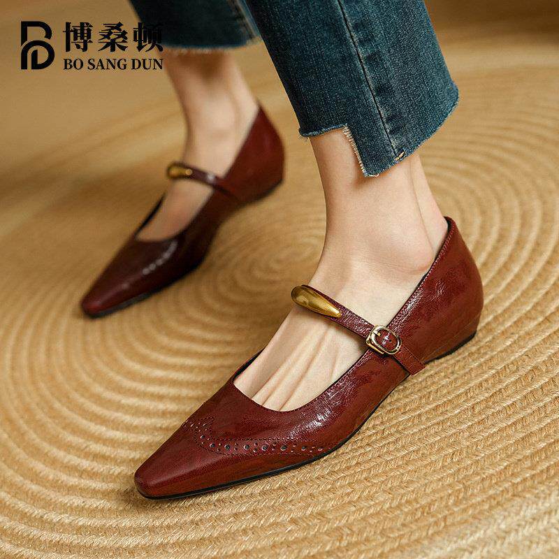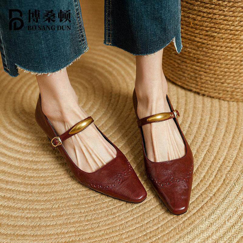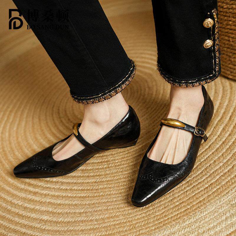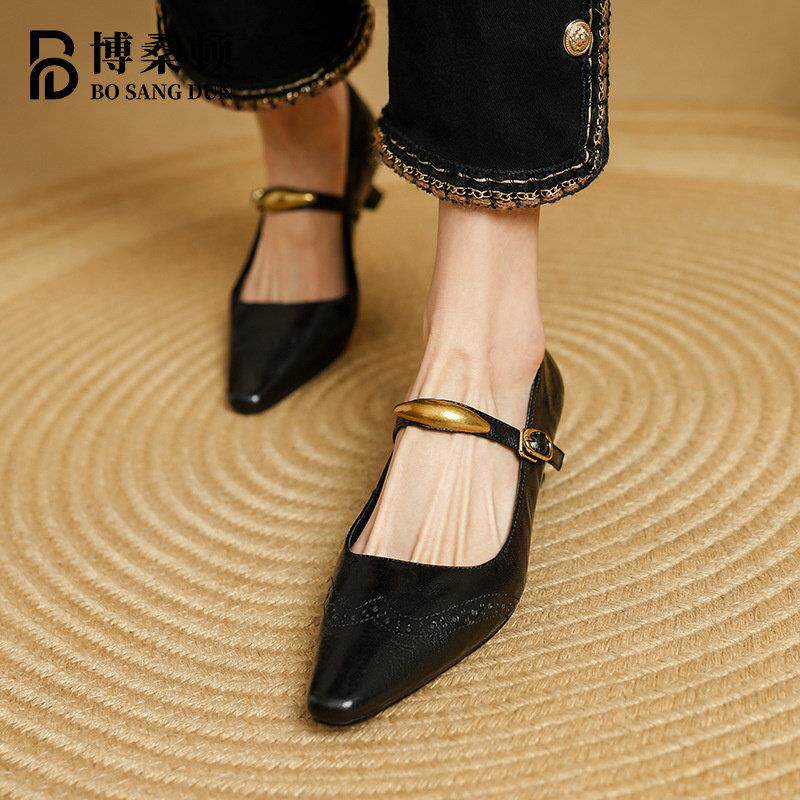 📚 博桑顿法式覆古真皮浅口单鞋女2025春夏新款尖头一字扣带玛丽珍鞋
