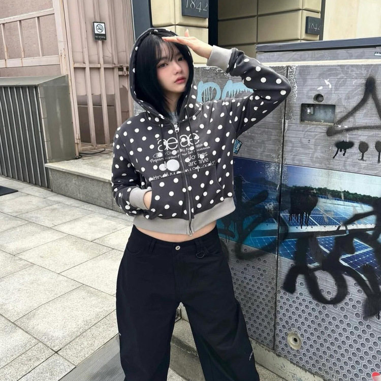📚 韩国小众潮牌aeae连帽卫衣女秋冬款辣妹修身短款波点字母刺绣