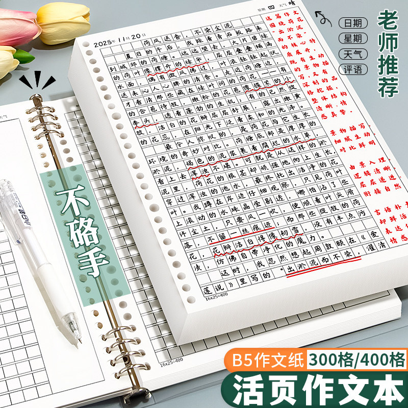 📚 B5活页本作文本语文方格16k开300格初中生800字作文纸小学生专用400格可拆卸笔记本子高考标准A4作文稿纸替芯