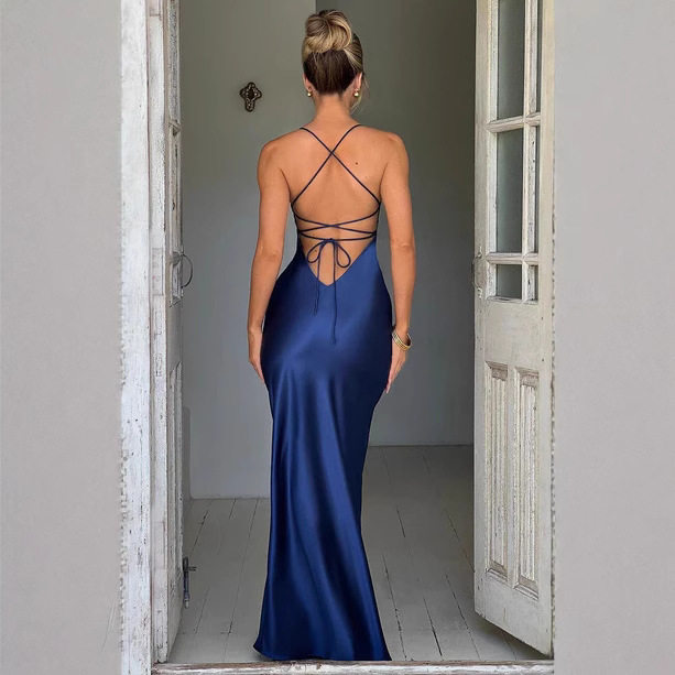📚 suspender V-neck satin slit sexy backless long skirt dress