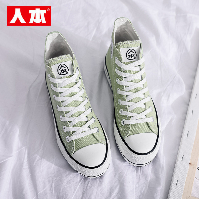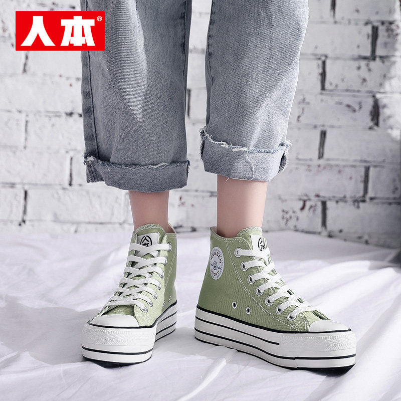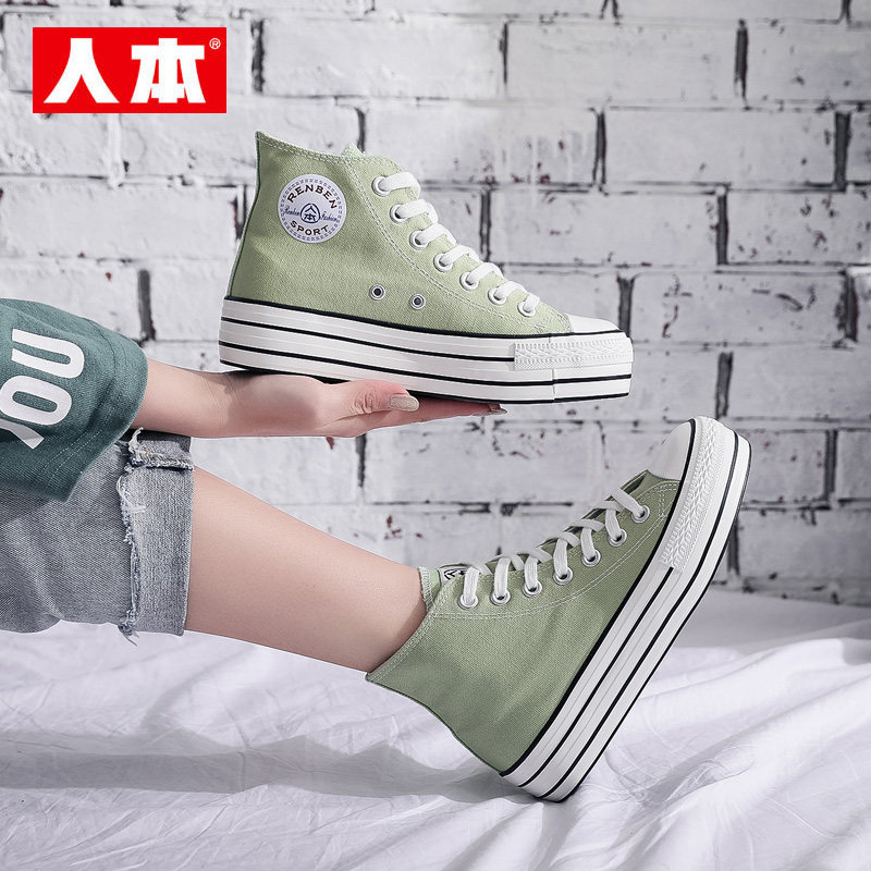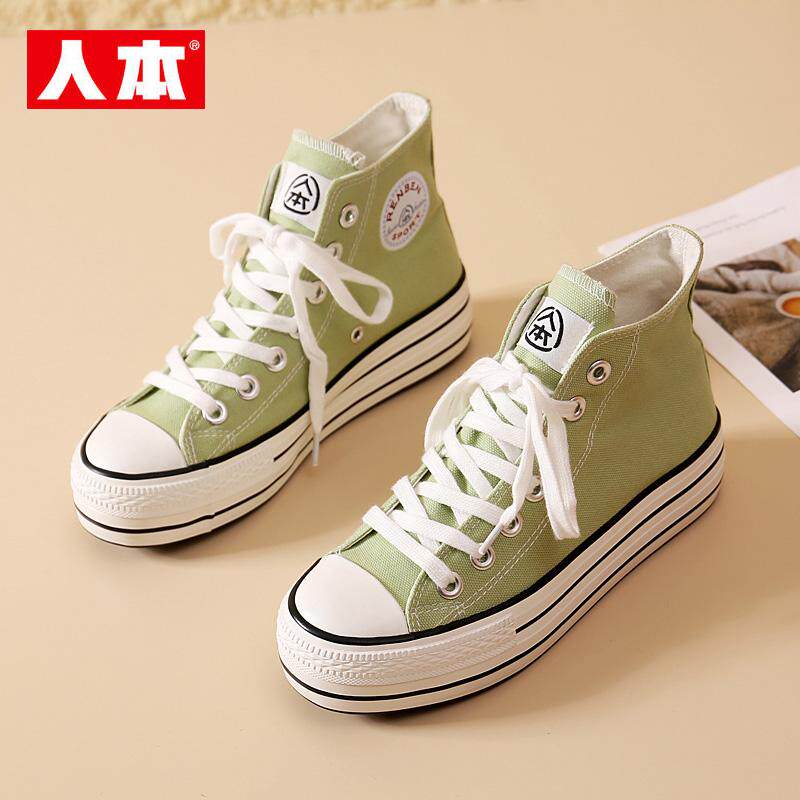 📚 人本高帮厚底帆布鞋女抹茶绿内增高6CM板鞋春秋透气百搭休闲女鞋