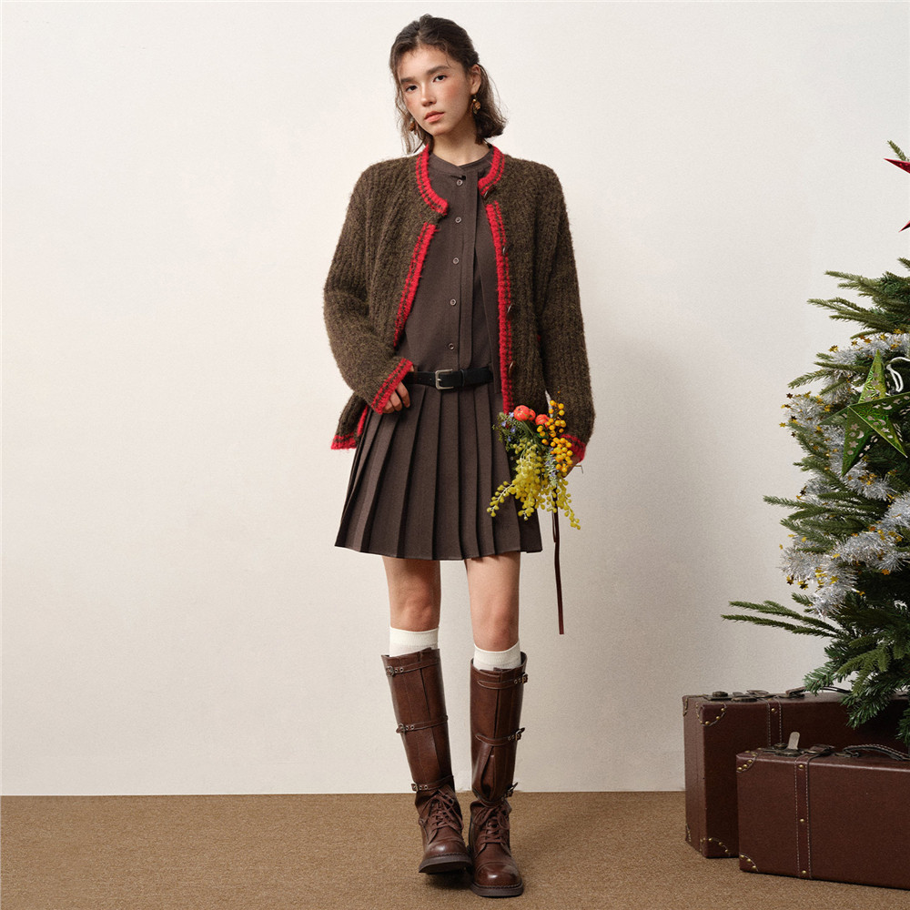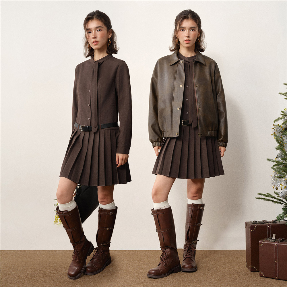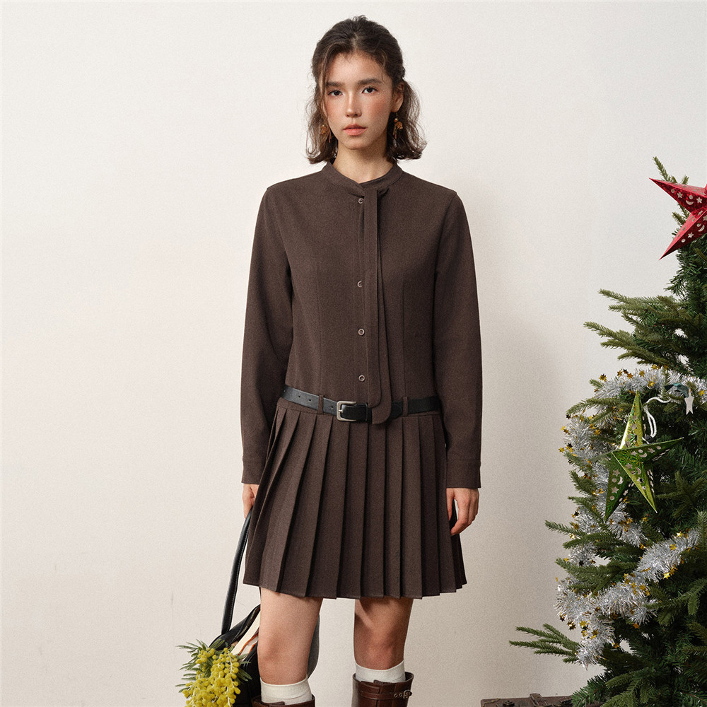 📚 设计师款佐丹奴长袖裙子女装新款法式系带立领百褶连衣裙18465302