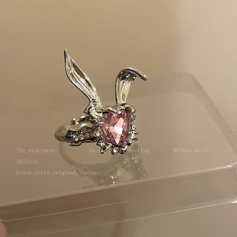 📚 创意搞怪爱心小兔子戒指女小众设计夸张食指戒学生可爱开口指环潮
