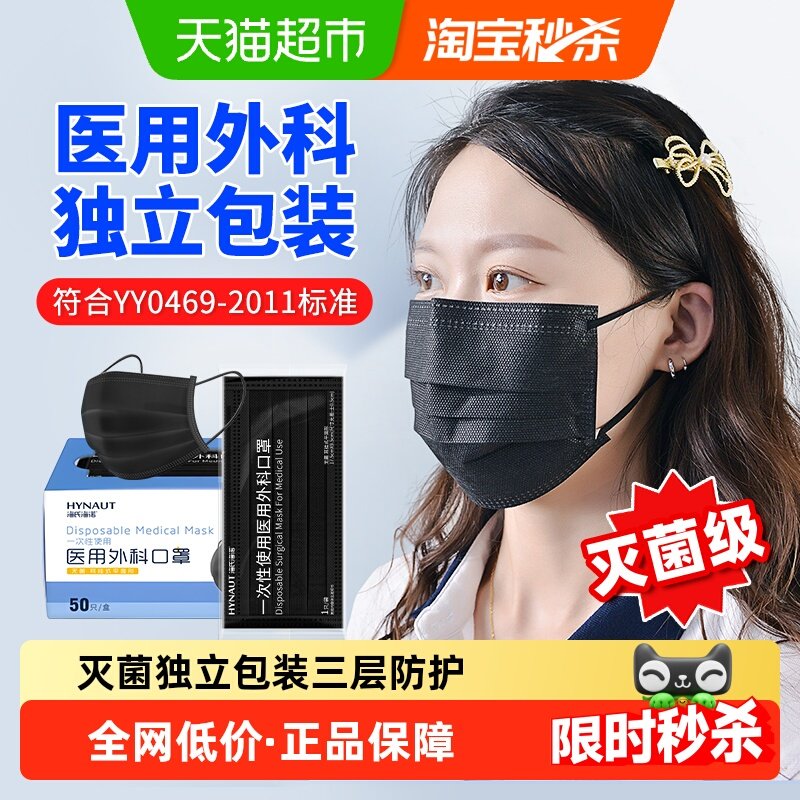 📚 海氏海诺一次性医用外科口罩成人50只黑色三层防护灭菌单只独立装